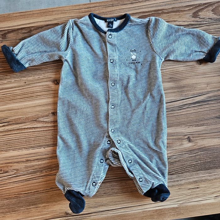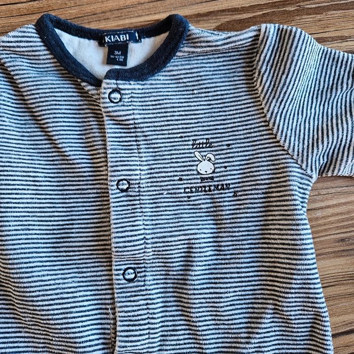 Pyjama en velours, rayé blanc et marine. Ouverture à l'avant. Taille 3 mois. Marque Kiabi. Très bon état. #bbtony_garcon_3mois Réductions activées : - 20% à partir de 2 articles - 30% à partir de 3 articles - 50% à partir de 5 articles