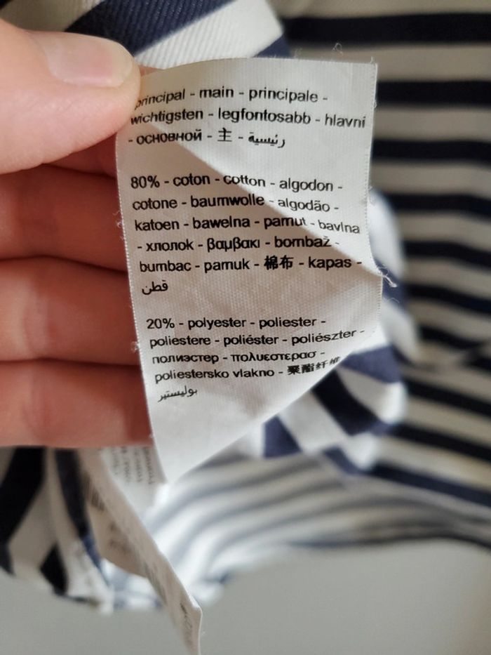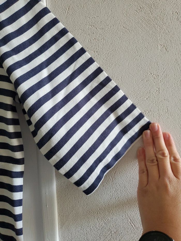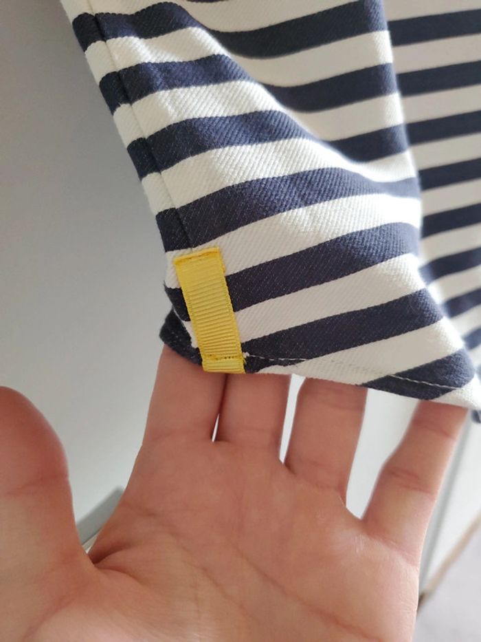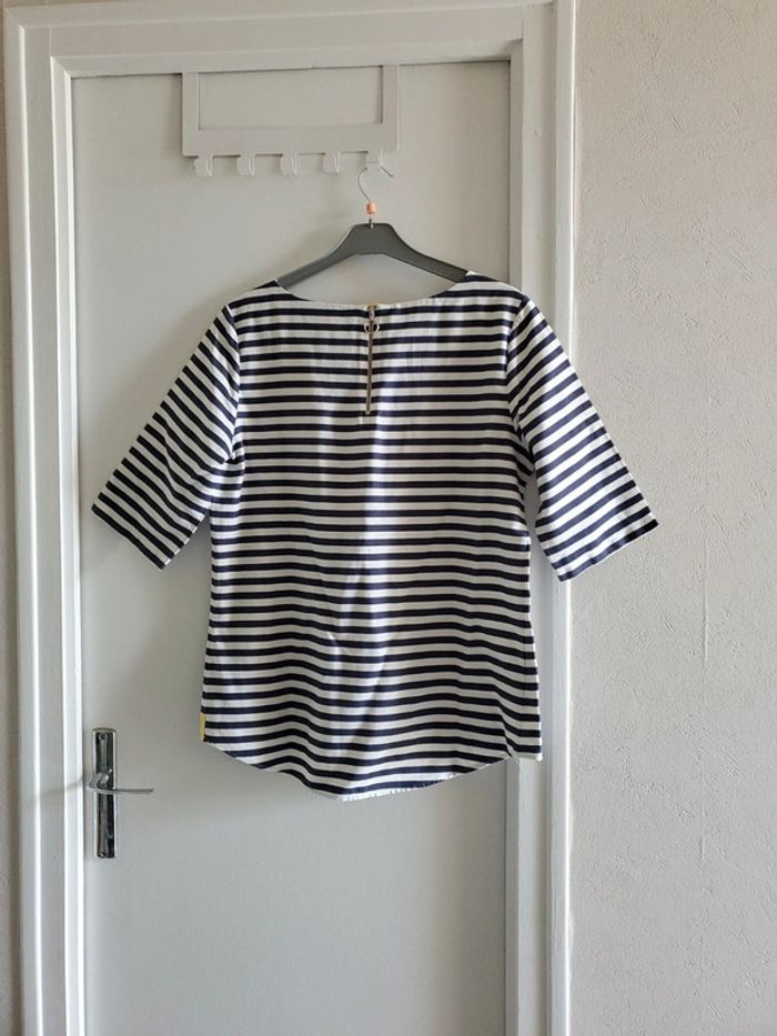 Blouse manches ¾, à rayures blanches et bleues marines avec une pointe de jaune PROMOD / T.40 Très bon état #blousesboulie2318 #boulie2318taille40
