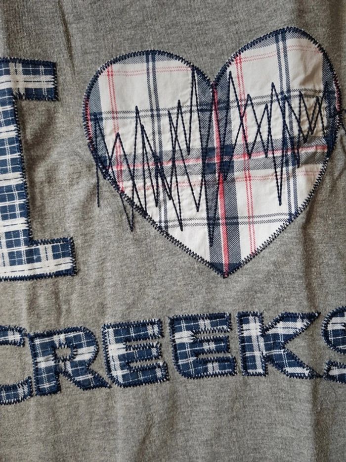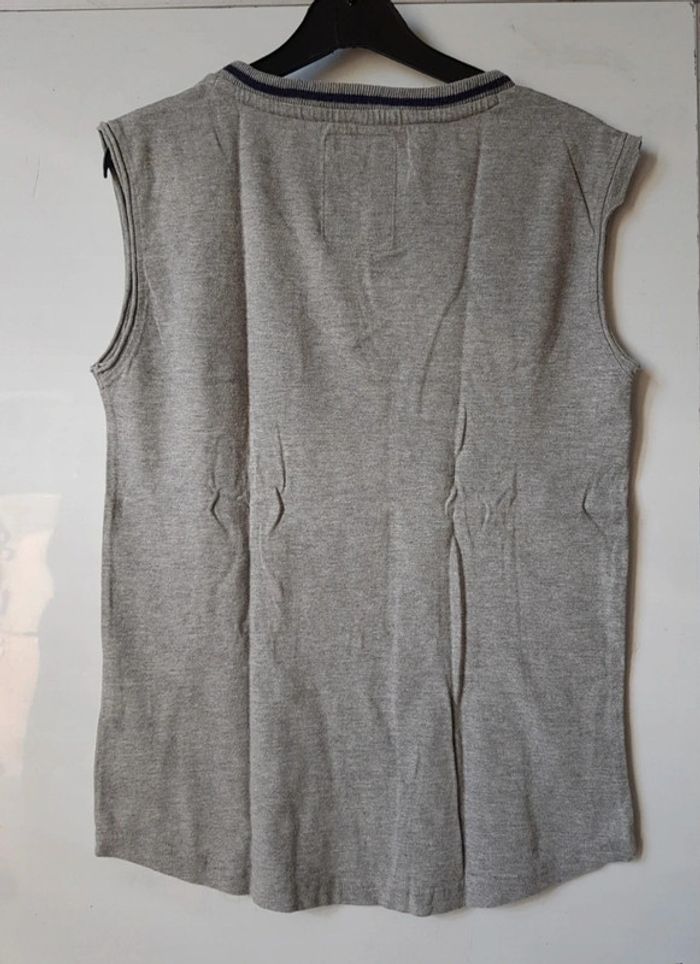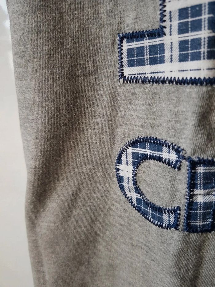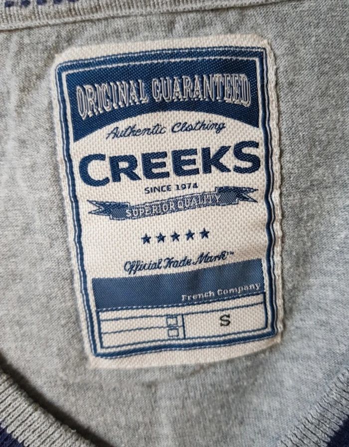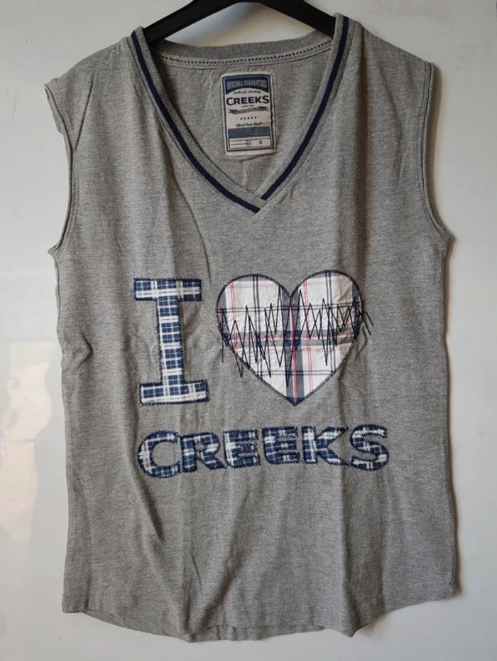 Débardeur, gris, blanc, bleu et rouge avec écriture T.S / CREEKS Porté, bon état (petite formation de bouloches) #boulie2318taille36