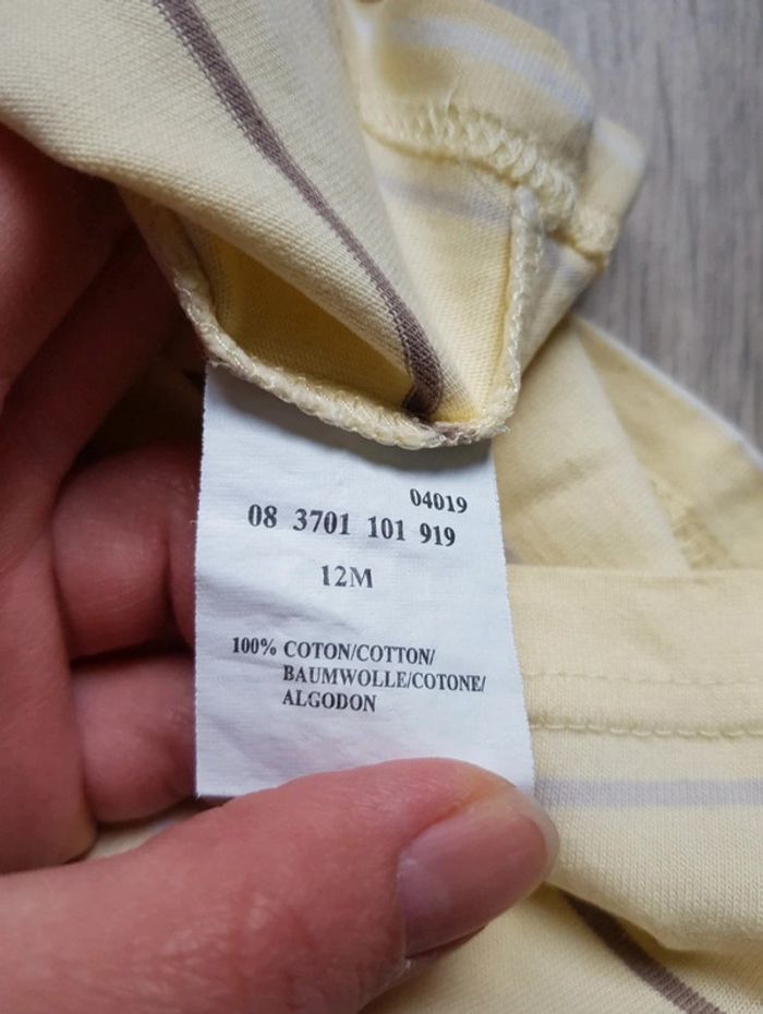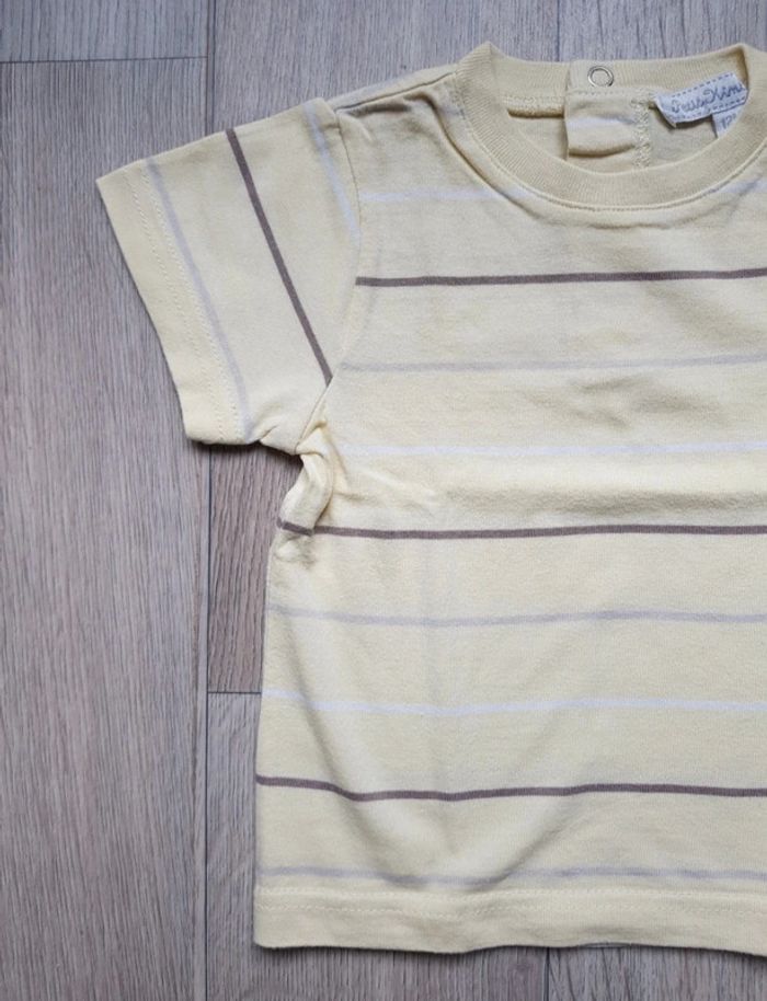 T-shirt Manches courtes, à rayures, jaune pâle, gris, blanc et taupe, 100% Coton 12 mois / PETIT KIMBALOO Bon État #12moisboulie2318
