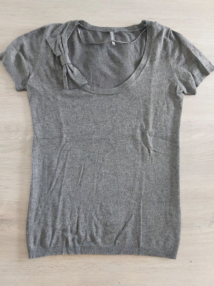 Pull manches courtes col rond gris, marque Naf Naf. Noeud sur col. Taille XS. Très bon état.