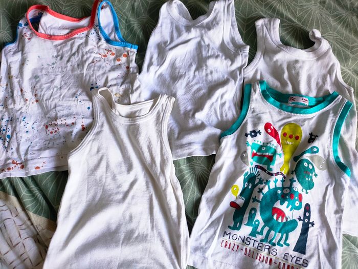 Lot débardeurs marcels 2 ans Pas neuf il peut y avoir une tâche mais bon état général sans l'ensemble Il y a du Tex Primark et Dpam