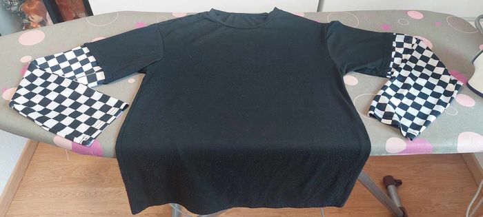 Joli sweat léger pour homme ou femme, noir, col rond, taille XS, manches en damiers noirs et blancs, en 95 % polyester et 5 % spandex, lavable en machine à 30° et en bon état (quelques bouloches mais rien de grave).