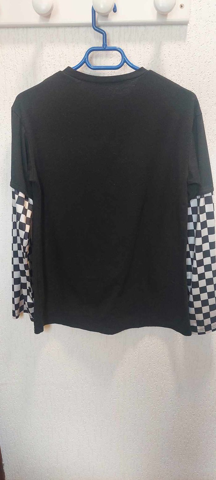 Joli sweat léger mixte noir XS manches damiers noirs/blancs en bon état - photo numéro 2