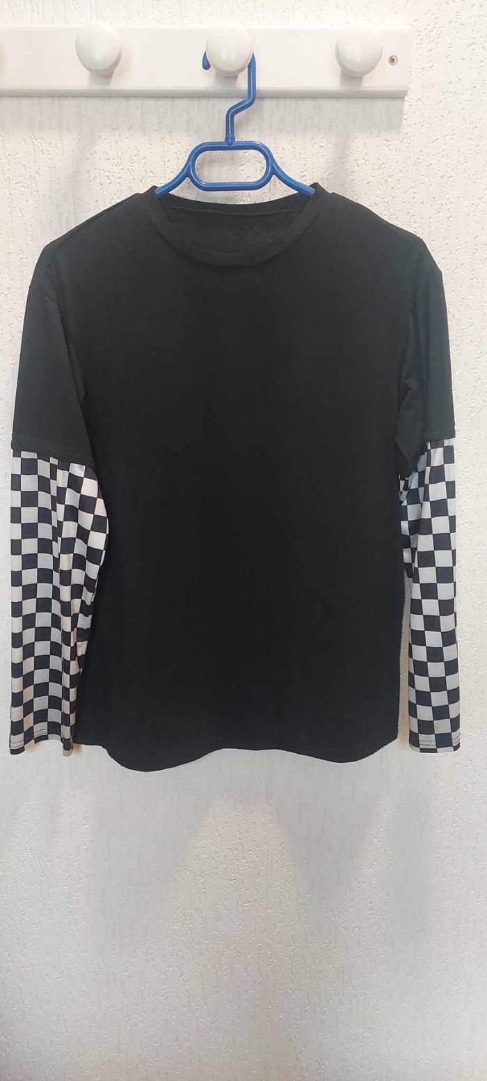 Joli sweat léger mixte noir XS manches damiers noirs/blancs en bon état - photo numéro 1