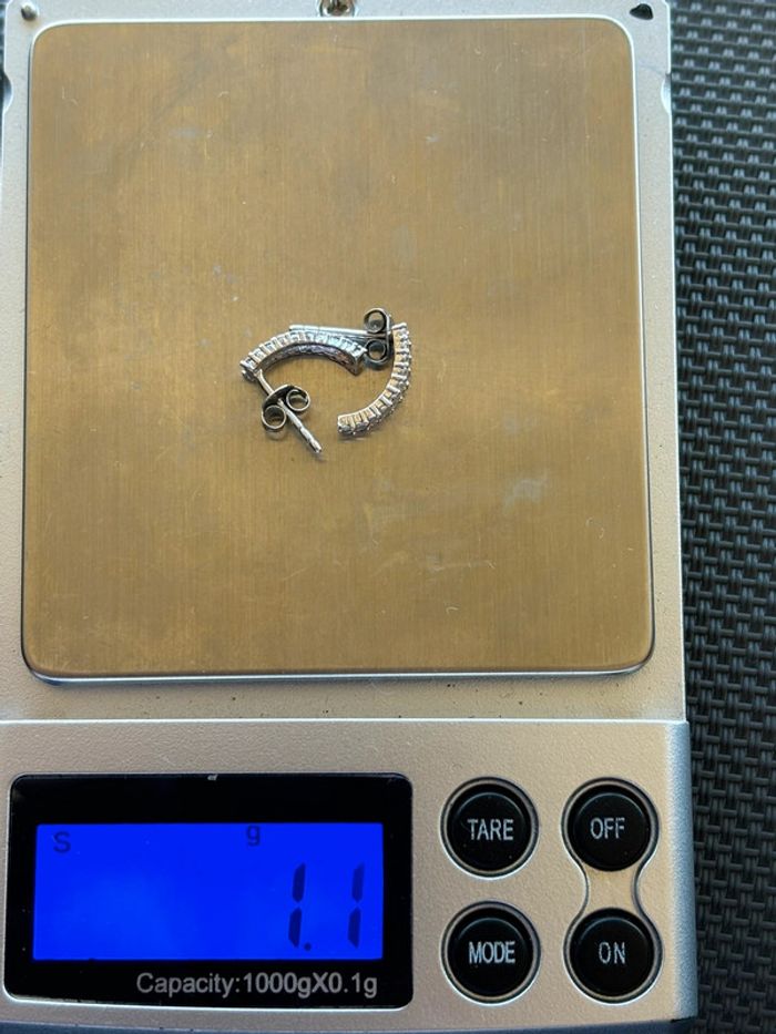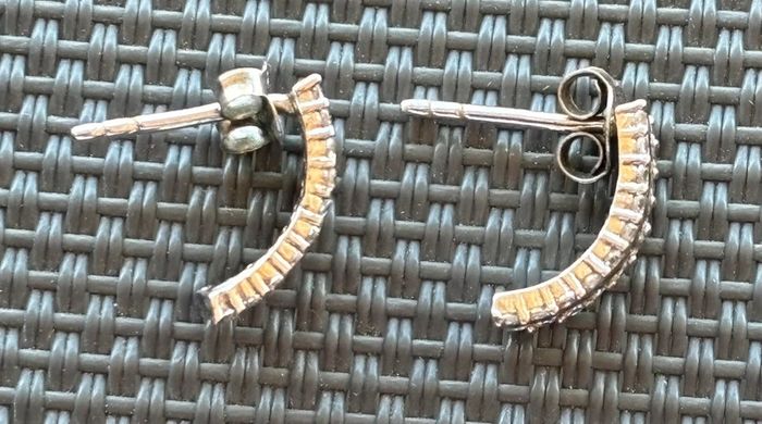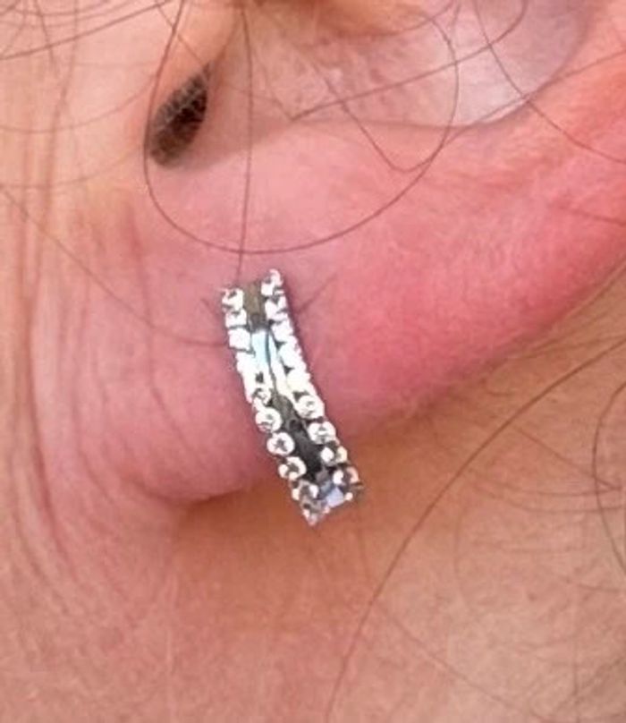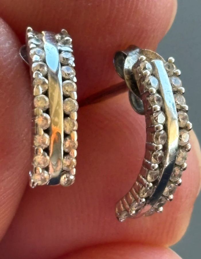 Jolie paire de boucles d’oreilles en forme de demi-cercle en métal argenté avec des petits brillants, pour femme, en très bon état. Bijoux fantaisie. Hauteur: 1,2 cm. #merine103 #merine103bijoux