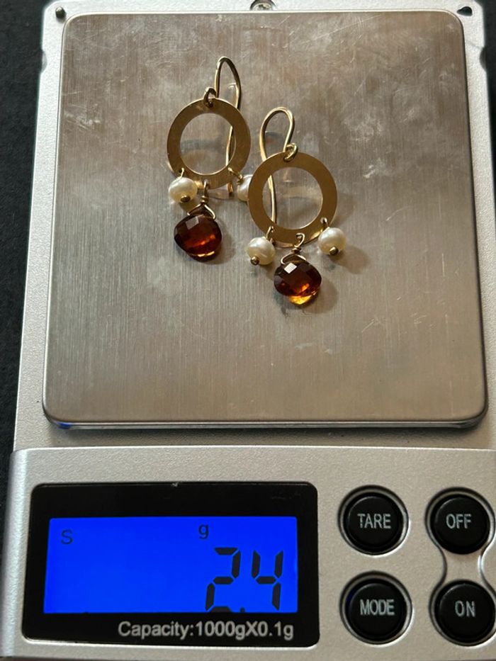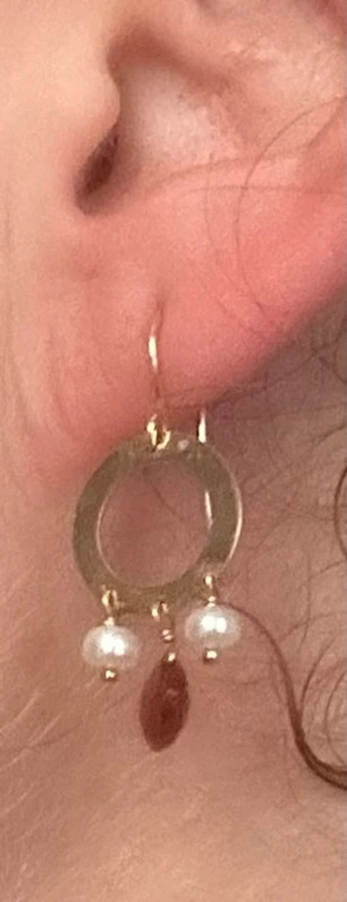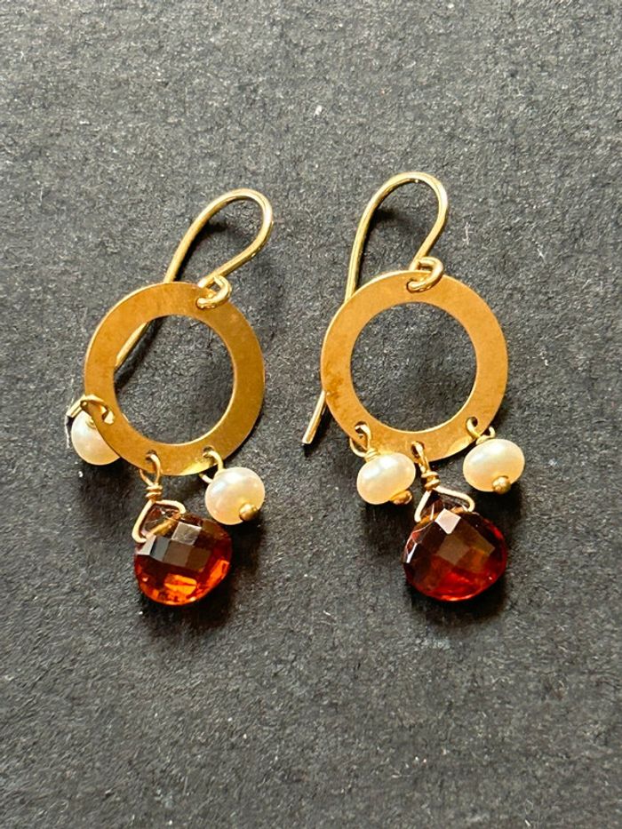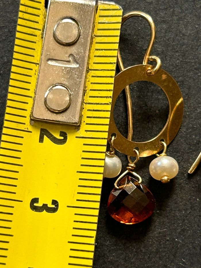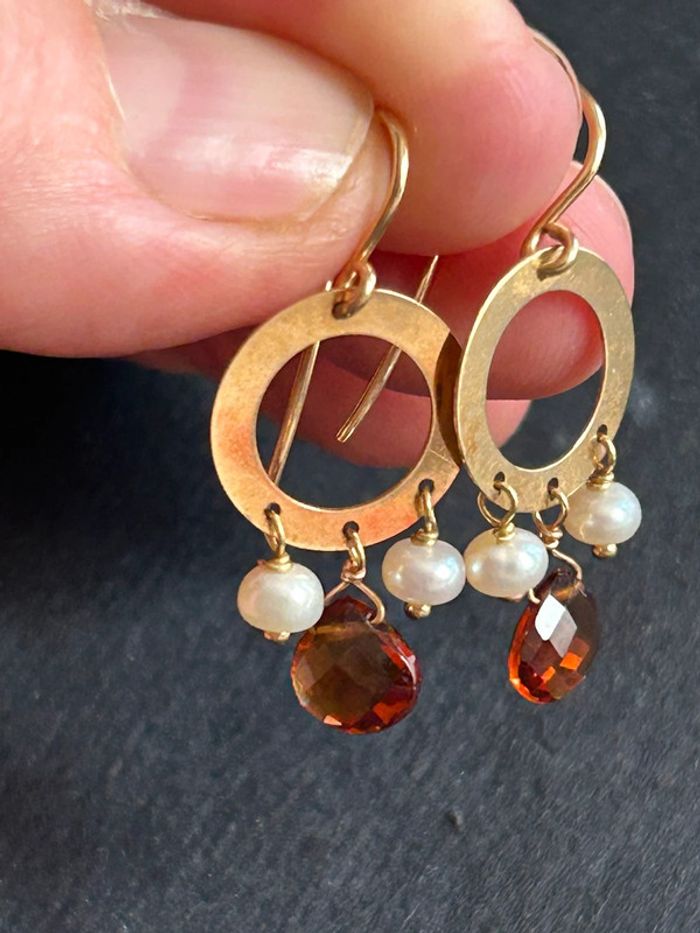 Jolie paire de boucles d’oreilles pendantes en or 18 carats 750/1000, avec des perles blanches et grenat, pour femme, en très bon état. Longueur: 3 cm, poids: 2,4 grammes. #merine103 #merine103bijoux