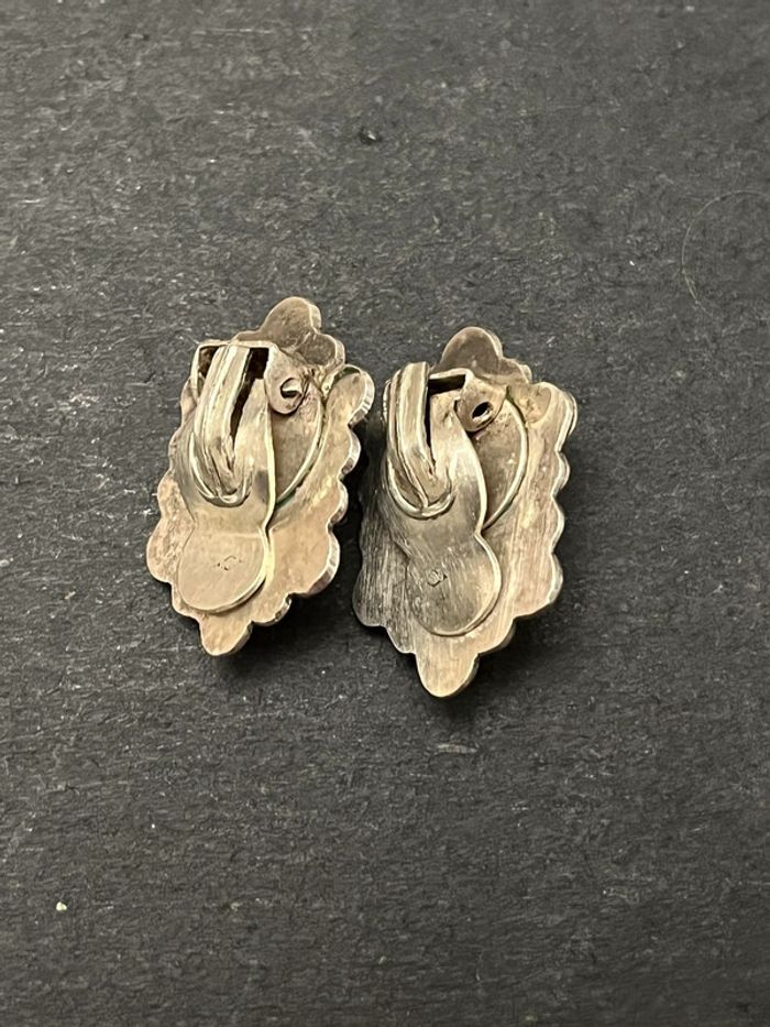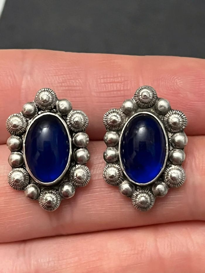 Jolie paire de boucles d’oreilles à clip en argent massif avec une pierre bleue ovale, pour femme, en très bon état. Longueur: 23 mm, poids: 7,2 grammes. #merine103 #merine103bijoux