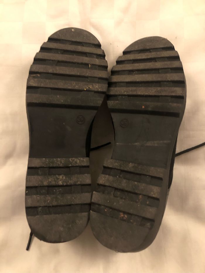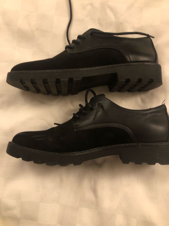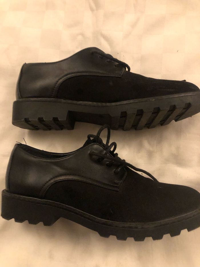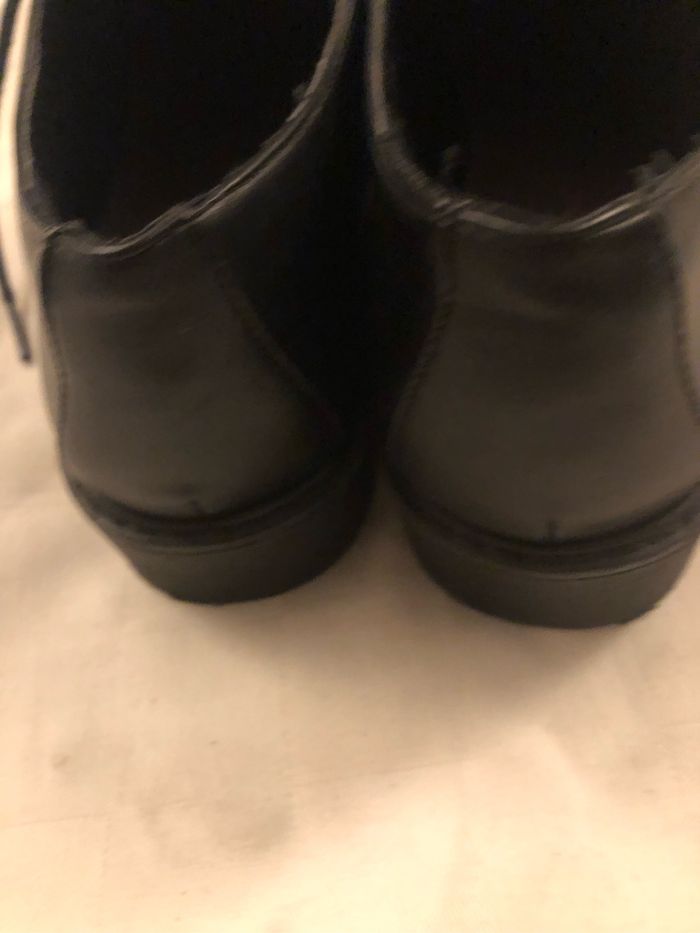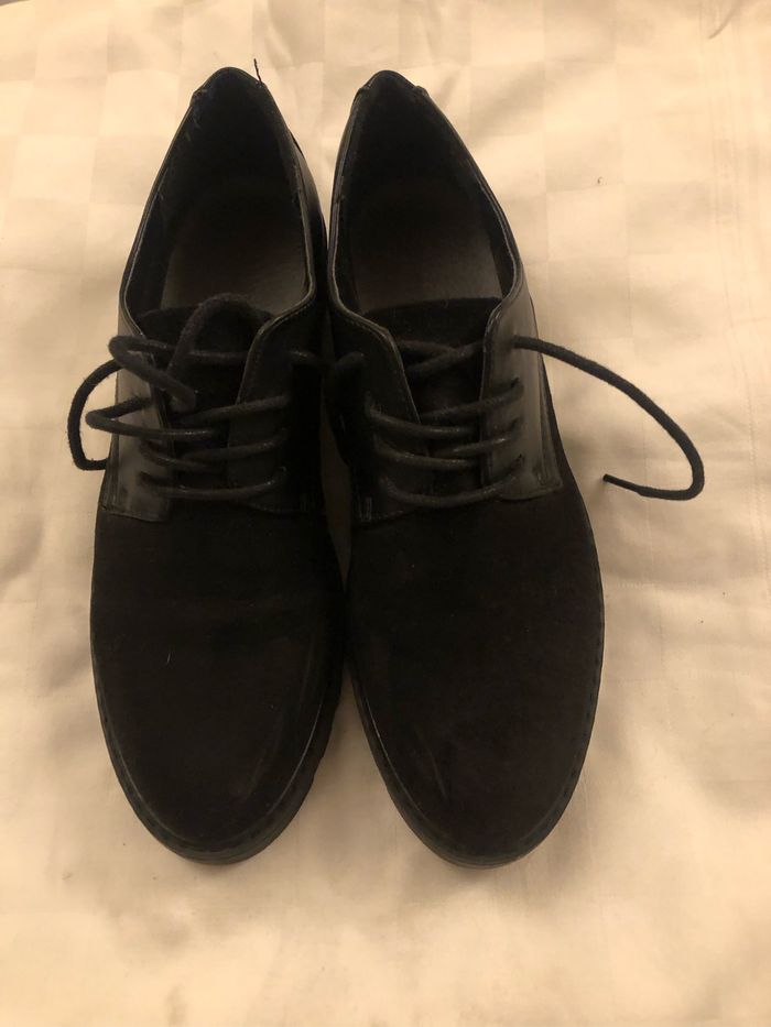 Chaussures à lacets noires nubuk et simili cuir, pointure 39. Peu portée s mais légères traces sur la pointe, peu visibles (voir photos 3 et 4) sinon en très bon état.