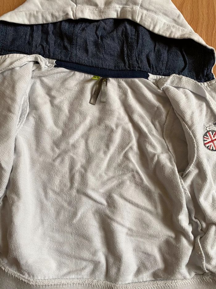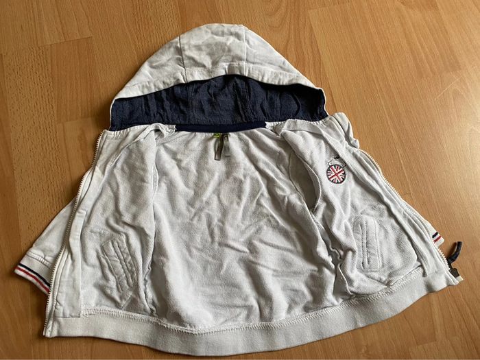 Beau gilet blanc à capuche de marque ORCHESTRA pour bébé garçon T. 9 mois/71 cm, en coton, en très bon état. Fermeture par zip, deux poches. #merine103 #merine103vetementbebe #merine103vetementgarcon #merine103vetementgarcon9mois #orchestra