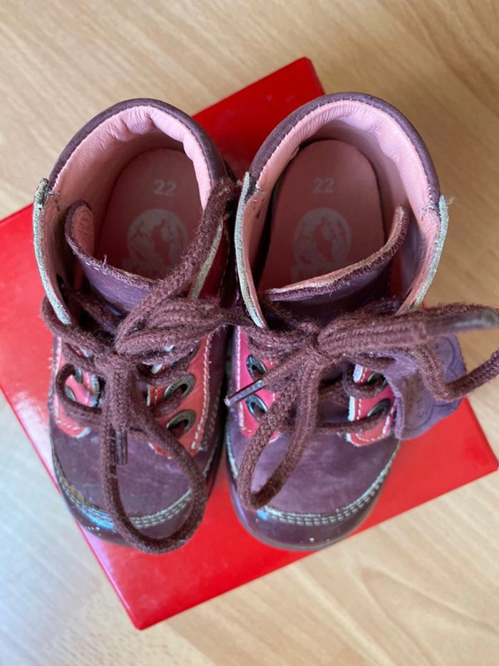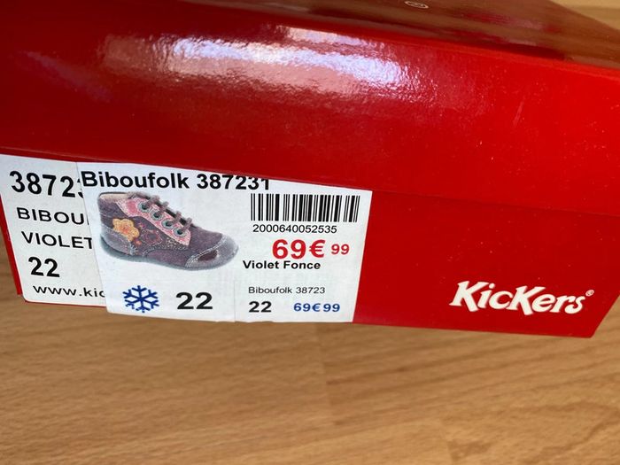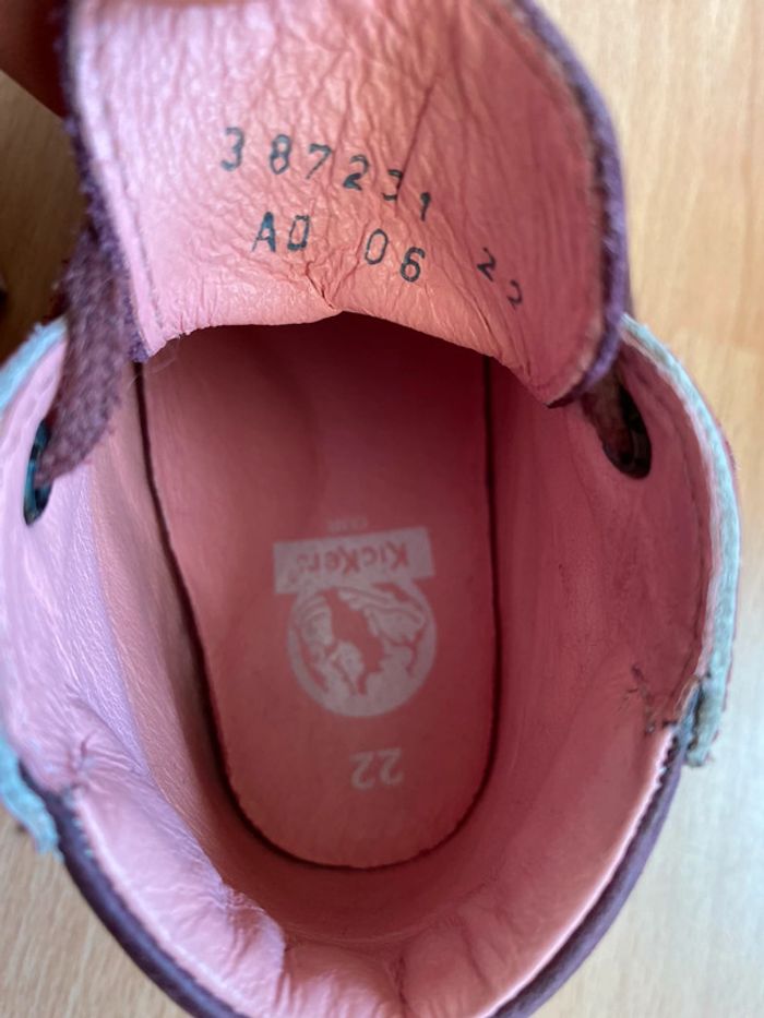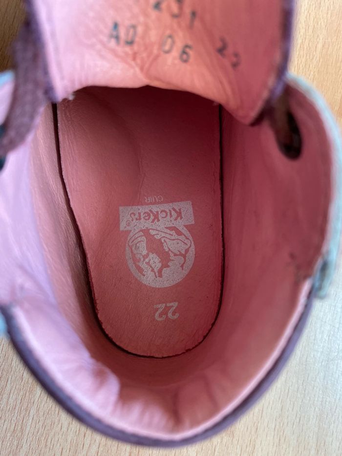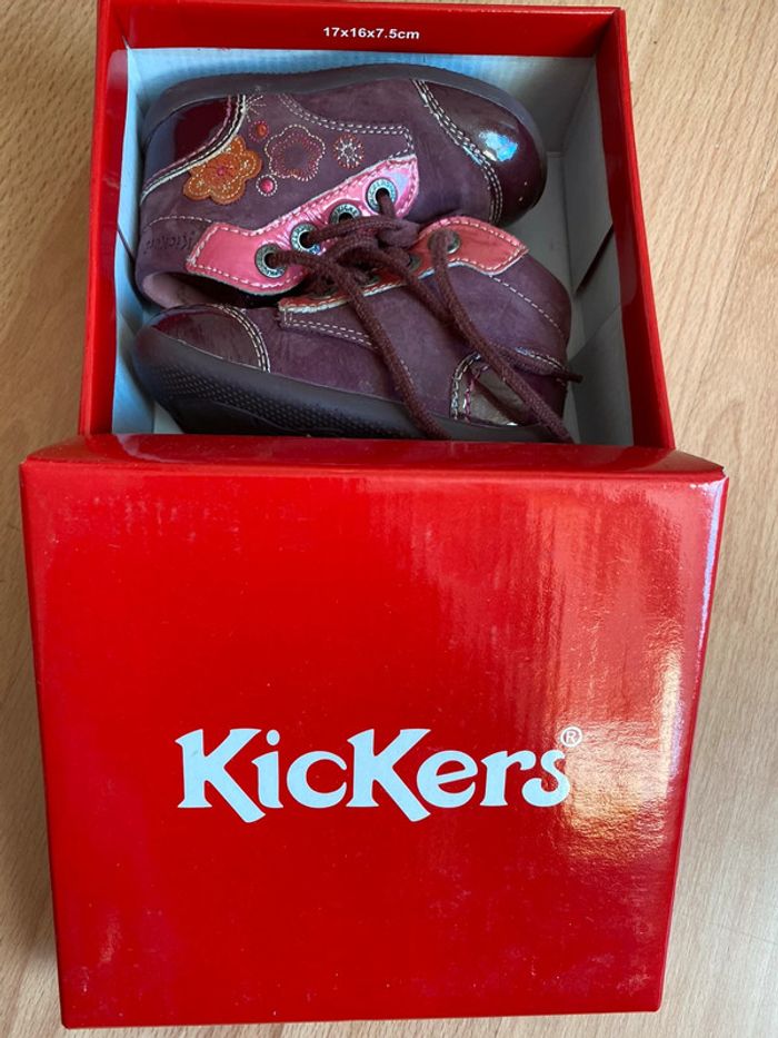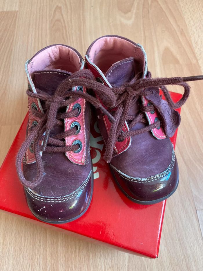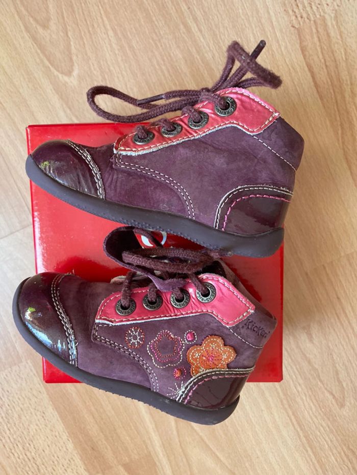 Belle paire de bottines en cuir verni violet de marque KICKERS pour bébé fille pointure 22, en bon état. Fermeture par lacets, vendues dans leur boîte d’origine. Bon maintien de la cheville et de la voûte plantaire. #merine103 #merine103chaussuresbebe #merine103chaussuresfille #merine103chaussuresfille22 #kickers #cuir