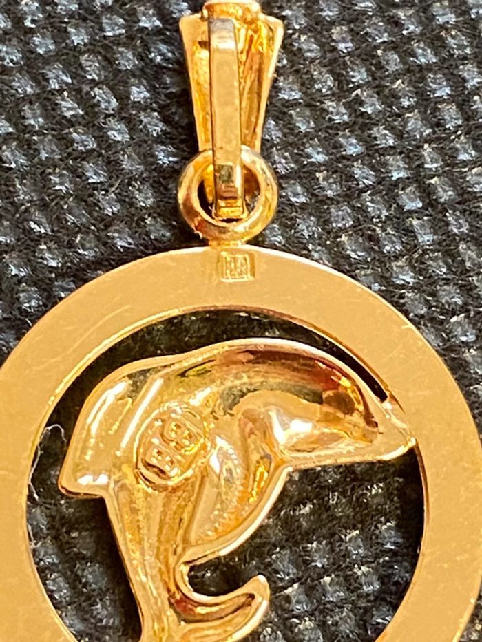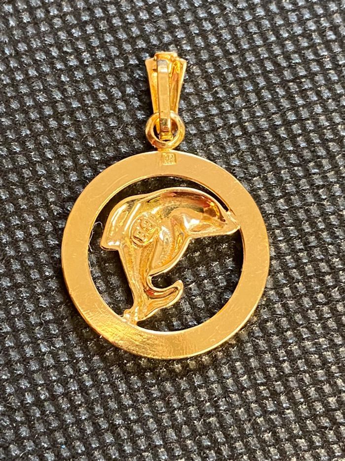 Beau pendentif en forme de dauphin dans un cercle, en plaqué or, en excellent état, comme neuf. Diamètre: 2 cm, poids: 3 grammes. #merine103 #merine103bijoux #bijoux #bijouxplaqueor #plaquéor