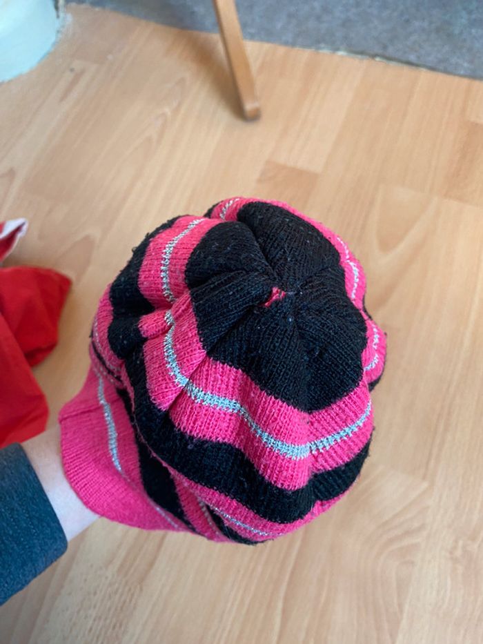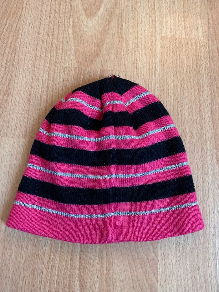 Joli bonnet HELLO KITTY/CHARMY KITTY à rayures noires, roses et argentées, T. 4 ans (52 cm) fille, en acrylique, en bon état. #merine103 #merine103vetementenfant #merine103vetementfille #hellokitty