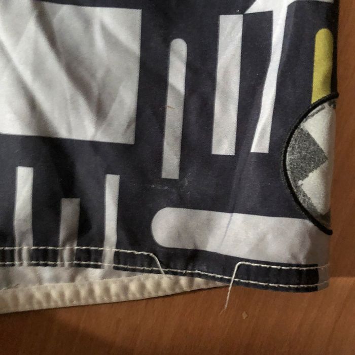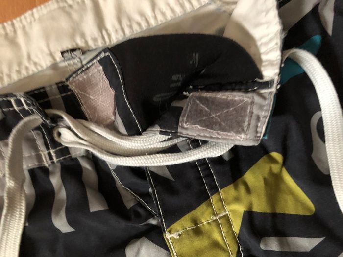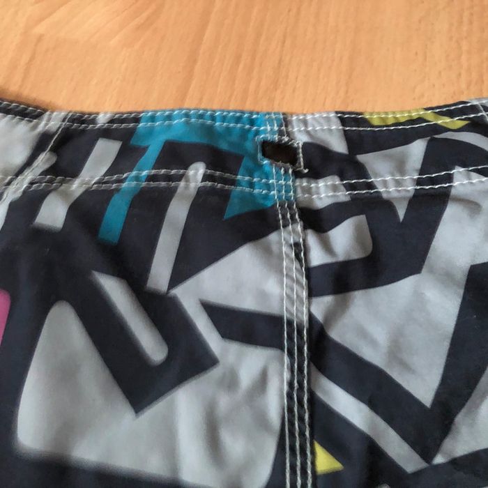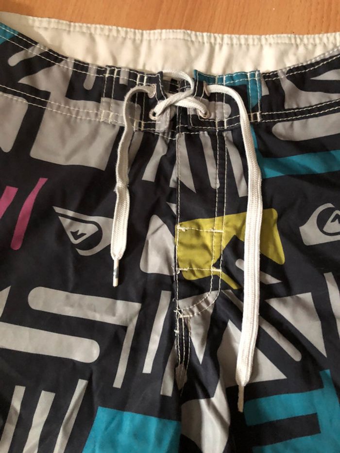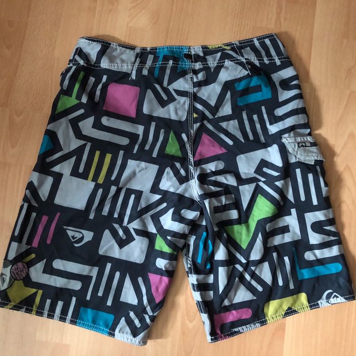 Beau short de bain/boardshort QUIKSILVER T. 32, avec motifs géométriques multicolores, en polyester, en bon état. Fermeture par scratch et lacets, sans filet à l’intérieur, 1 poche. L’une des coutures est décousue sur 1,5 cm mais c’est très peu visible. #merine103 #merine103vetementhomme #quiksilver
