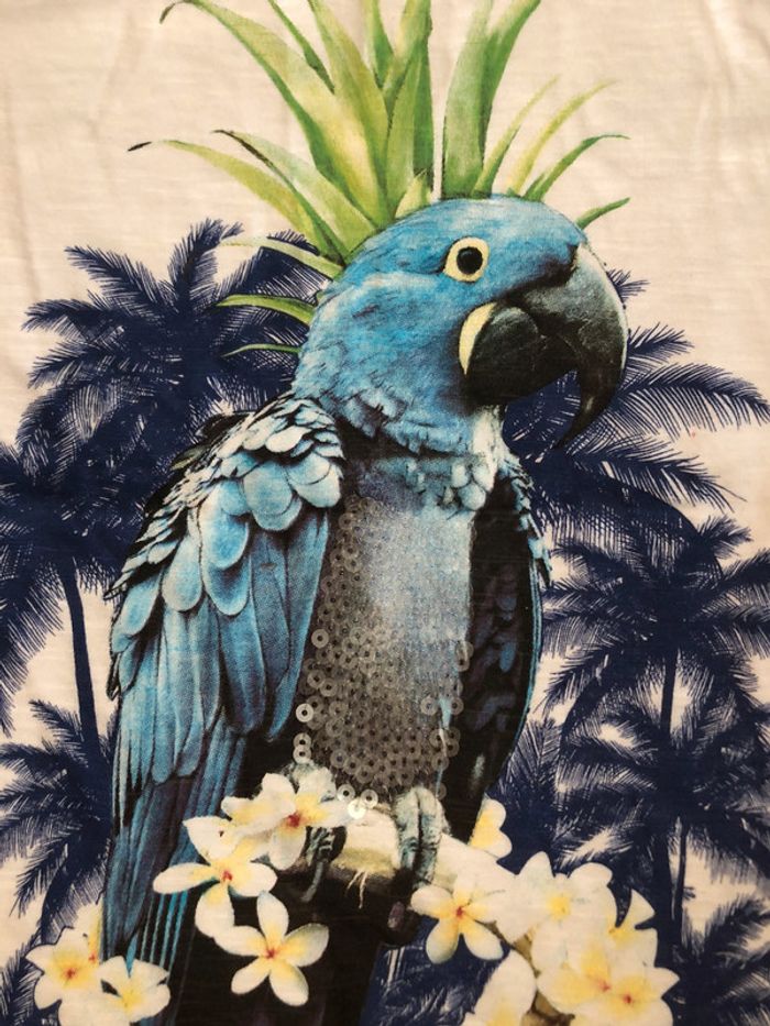 Joli T-shirt à manches courtes blanc motifs « perroquet » avec des petits sequins, pour fille T. 5-6 ans/116 cm, en coton, neuf avec étiquette. #merine103 #merine103vetementenfant #merine103vetementfille #5ans #6ans