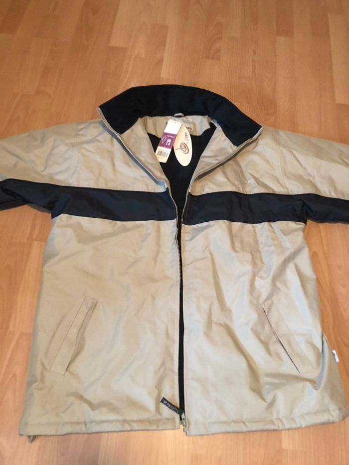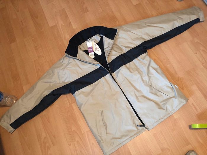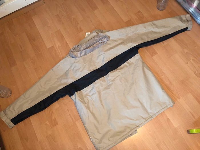 Belle parka beige et bleu marine, bien chaude doublée en polaire, pour homme T. XXL (6), en polyester enduit PVC, intérieur polyester (polaire), neuve avec étiquette. Fermeture par zip, col montant, deux poches extérieures et deux poches intérieures, cordons de resserrage sur le bas, petite capuche rangée dans le col. #merine103 #merine103vetementhomme #merine103vetementhommexxl