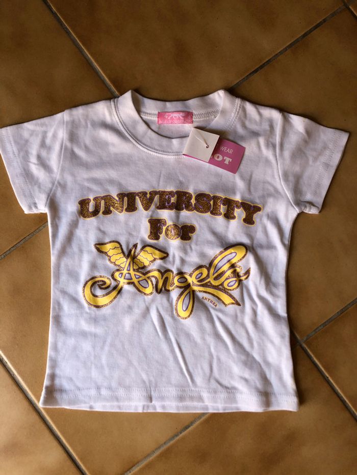 Beau T-shirt blanc à manches courtes avec motifs à paillettes dorées, pour fille T. 4 ans, en coton et polyester, neuf avec étiquette. #merine103 #merine103vetementenfant #merine103vetementfille #4ans