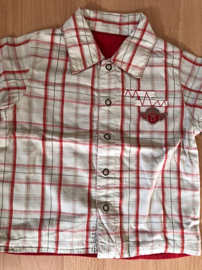 Belle chemise à manches longues rouge et beige à carreaux, réversible en chemise rouge, pour bébé garçon T. 18 mois/81 cm, en coton, en très bon état. Fermeture par boutons, 1 poche, taille grand. #merine103 #merine103vetementbebe #merine103vetementgarcon