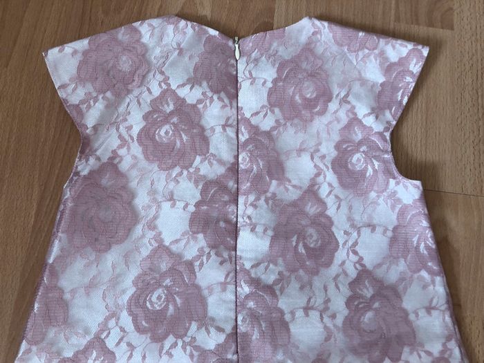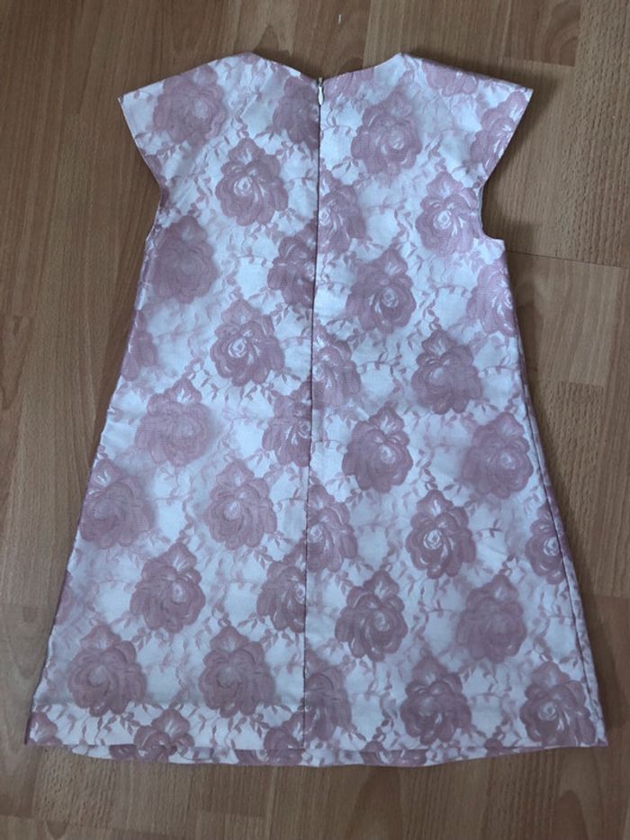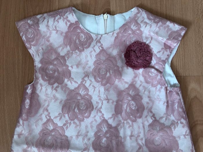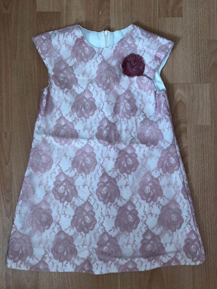 Très belle robe de cérémonie à manches courtes blanches avec des roses en tulle brodé, entièrement doublée, en polyester, de très bonne qualité, en très bon état. Fermeture par zip dans le dos, petite rose cousue sur le devant.