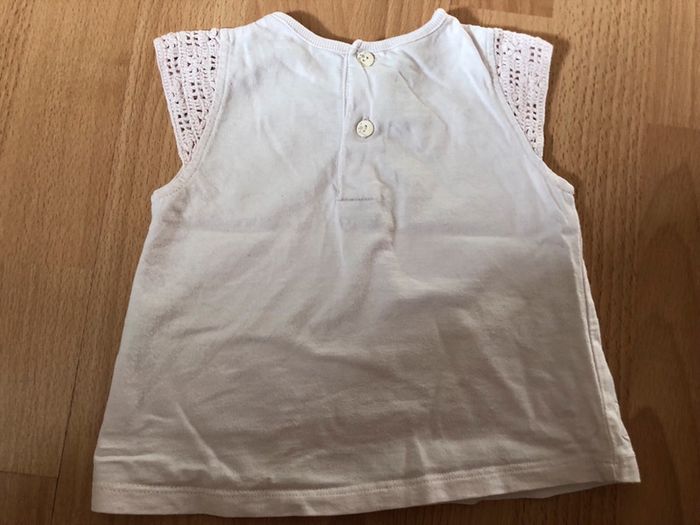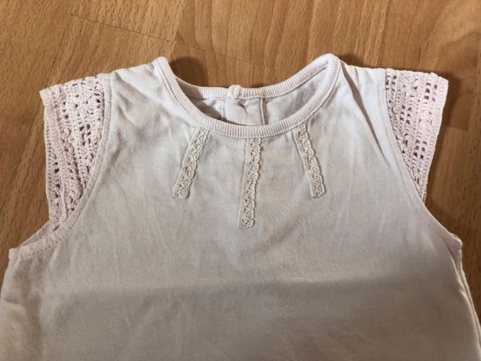 Joli T-short rose clair à manches courtes façon crochet, de marque SERGENT MAJOR, T. 12 mois, pour fille, en coton, en très bon état. Fermeture par boutons dans le dos. #merine103 #merine103vetementbebe #merine103vetementfille