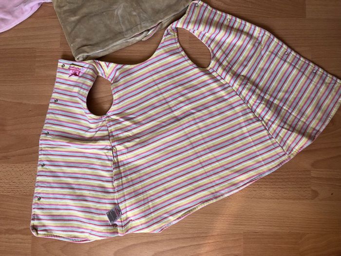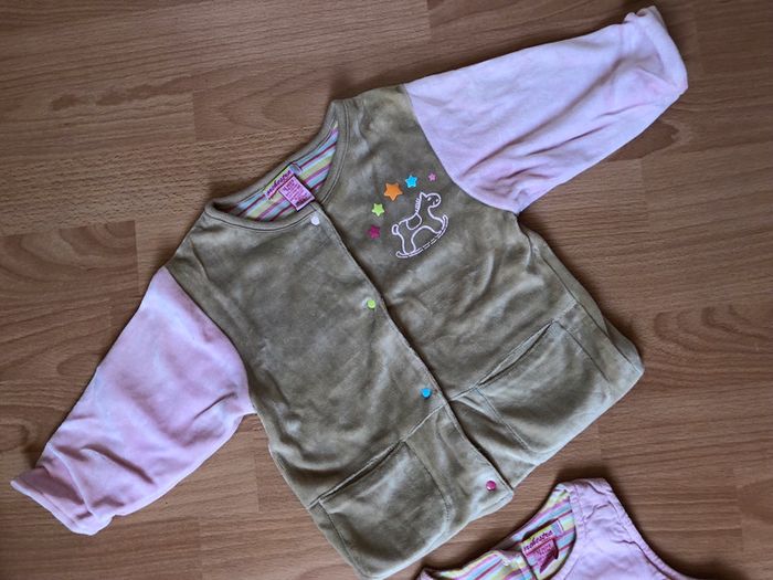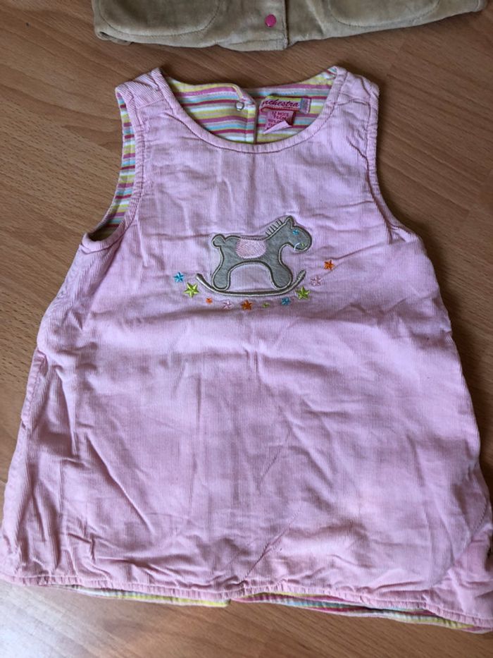 Bel ensemble pour fille T. 12 mois/74 cm de marque ORCHESTRA, en velours bien chaud, en coton, en très bon état, idéal pour l’hiver. Robe sans manches, extérieure en velours rose clair avec motif « cheval à bascule », intérieur entièrement doublé en coton à rayures multicolores, fermeture par boutons dans le dos, + gilet à manches longues, en velours, beige et rose, intérieur doublé coton, fermeture par boutons. #merine103 #merine103vetementbebe #merine103vetementfille