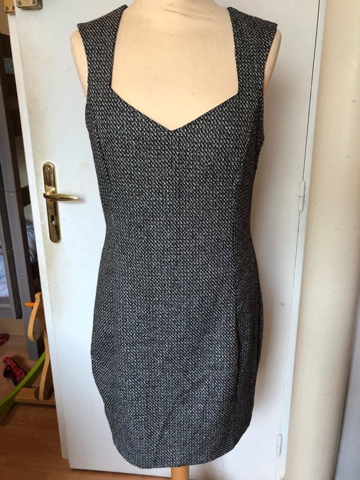 Jolie robe courte sans manches, noire et blanche avec motifs, de marque MANGO, décolleté en semi-V, en polyester, viscose et elasthanne, entièrement doublée en polyester et elasthanne, fermeture éclair dans le dos, en très bon état. Poitrine: 44 cm, hanches: 50, longueur: 86 cm.