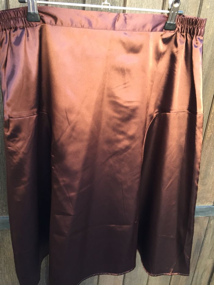 Jupe ou fond de jupe mi-long T.44 marron aspect satiné Anne WEYBURN en excellent état, comme neuve. Taille élastiquée, fermeture bouton + zip sur le côté, en polyester et elasthanne entièrement doublé polyester. Ceinture 42 cm, hanches 58 cm, longueur 64 cm. #merine103 #merine103vetementfemme #merine103vetementfemme44
