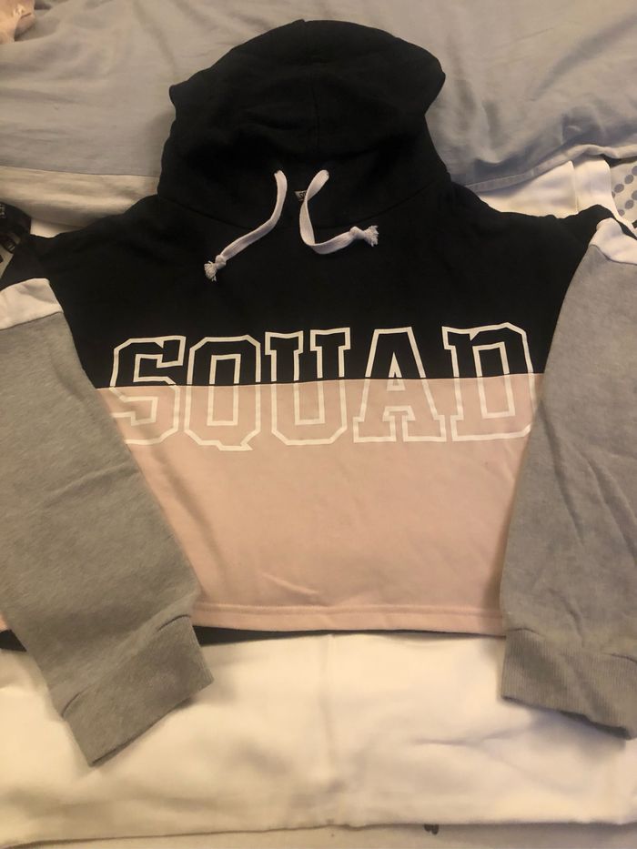 Sweat-shirt court à capuche, Primark, taille 46, noir et rose sur le devant avec inscription « squad » sur le devant. Bon état général