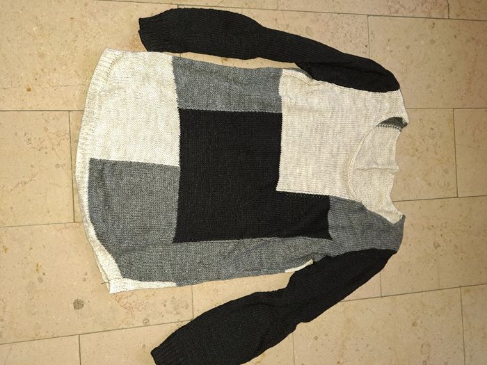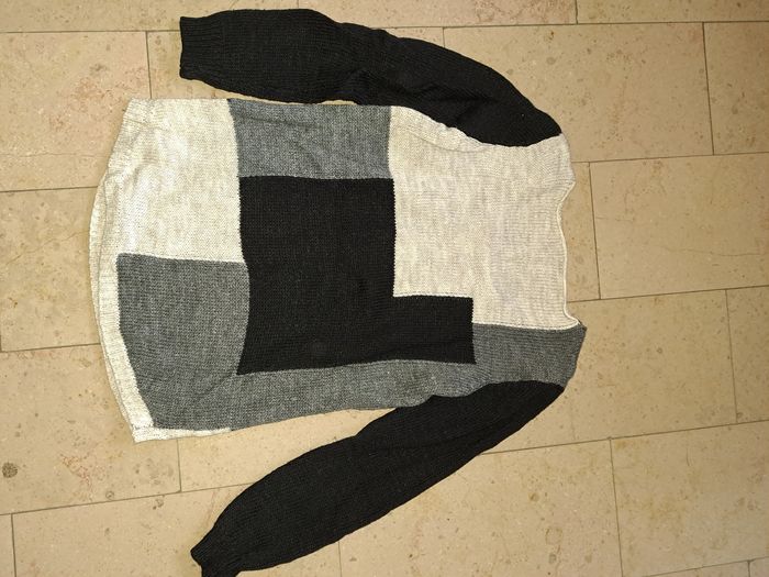Pull femme Taille unique (pas d'étiquette) Couleur blanc, gris et noir Laine, acrylique et mohair Col rond État impeccable