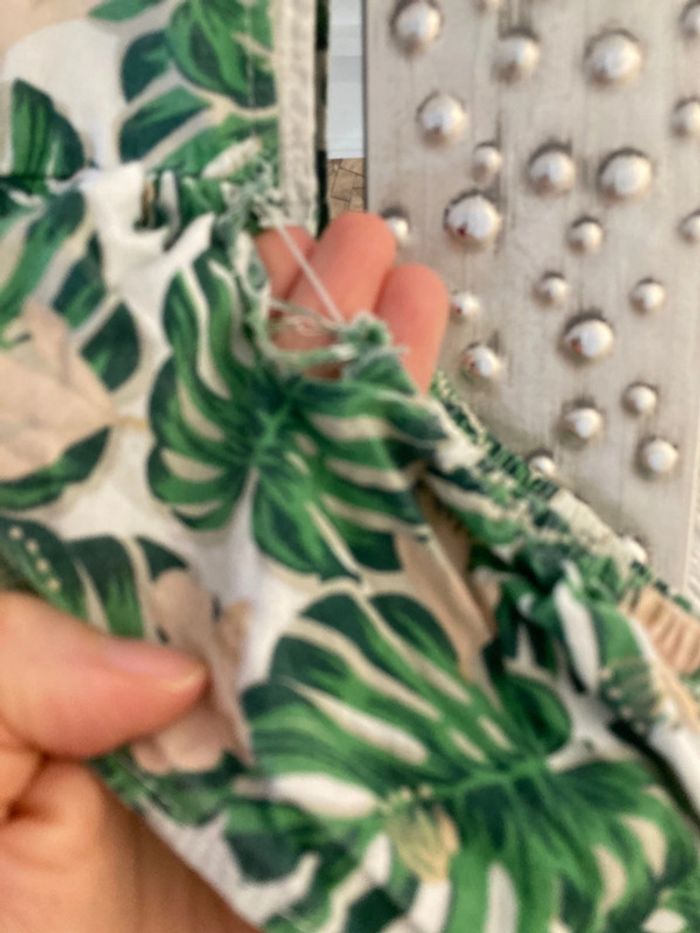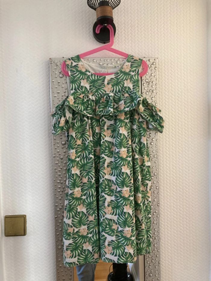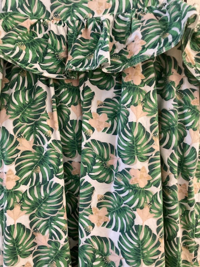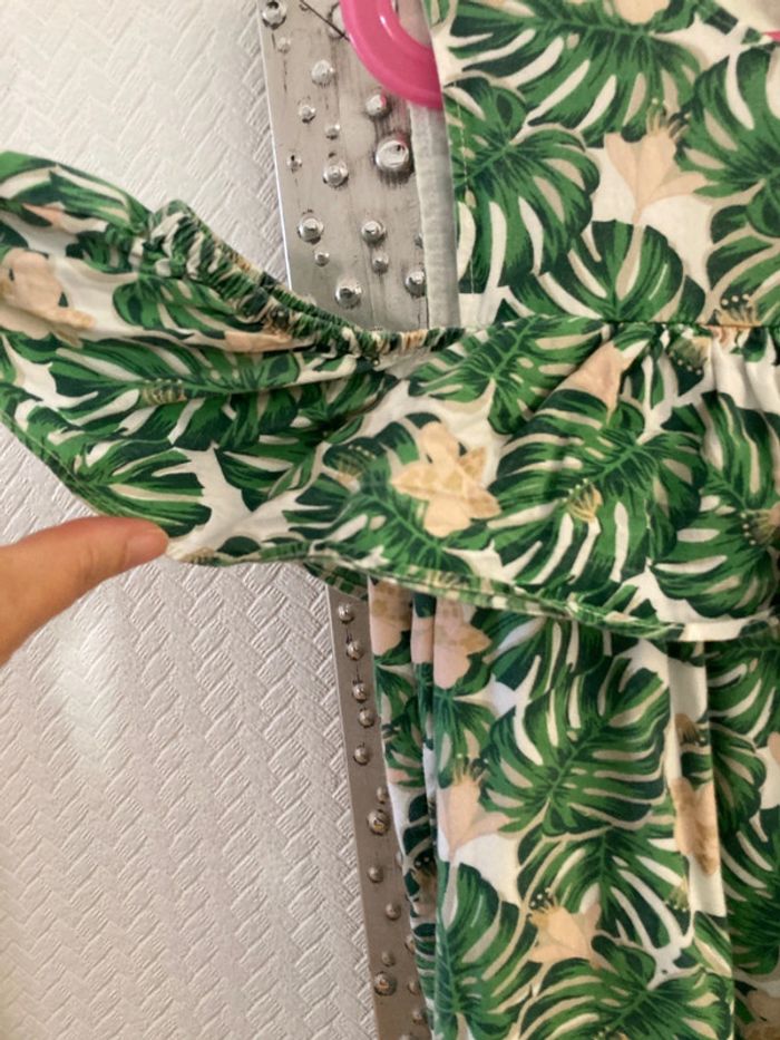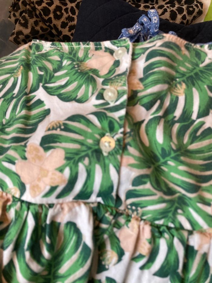 Joli robe verbaudet Doublé Motif feuille avec petit volant au niveau de épaules Déchirée à 2 endroits => à reprendre ( au niveau du volant côté gauche et sous l’aisselle du même côté).