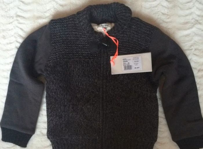 Cardigan chaud taille 3 ans (taille grand) MARÈSE neuf avec étiquettes composition Dessus 55% acrylique 46% coton Doublure 60% polyester 40% coton #namalo02garçon3ans