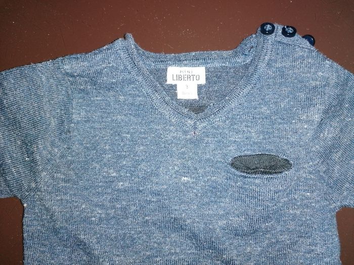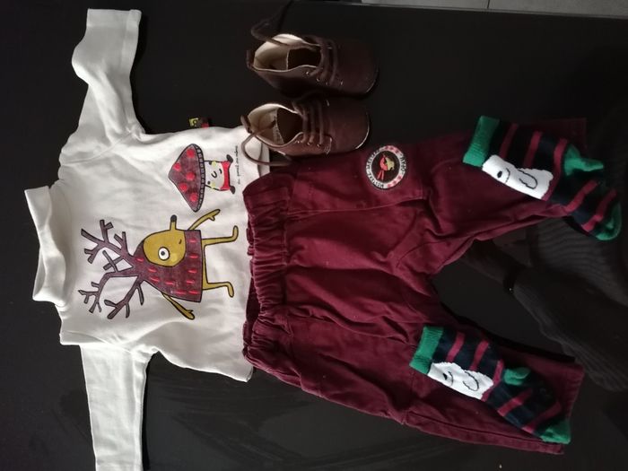 Un ensemble garçon DPAM, un pantalon Pat et Ripaton (très chaud, fourré) un pull Liberto taille 3 mois et une paire de chaussures 3/6 mois bon état