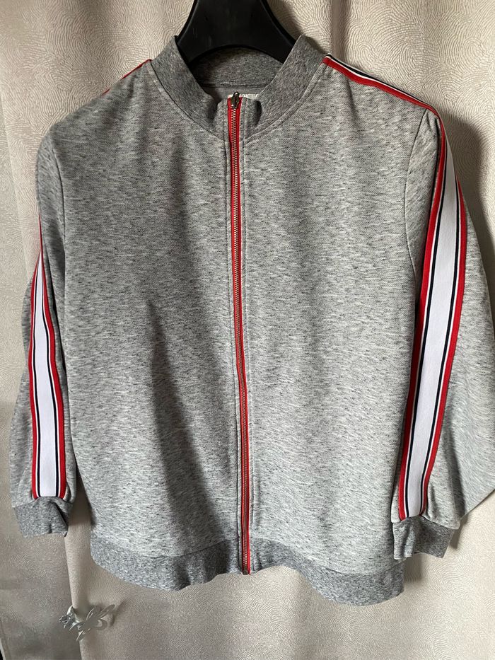 Gilet en parfait état gris chiné Grande fermeture rouge Large bande sur les manches blanche, rouge et noir 2 poches 62% coton 38% polyester Taille L Jules Carrure 45,5 cm Aisselle à aisselle 59,5 cm Longueur 68,5 cm