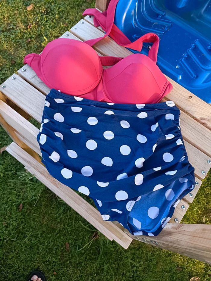 Maillot de bain 2 pièces mais bas taille haute avec effet drapé Haut rose et bas marine à petit pois Taille L