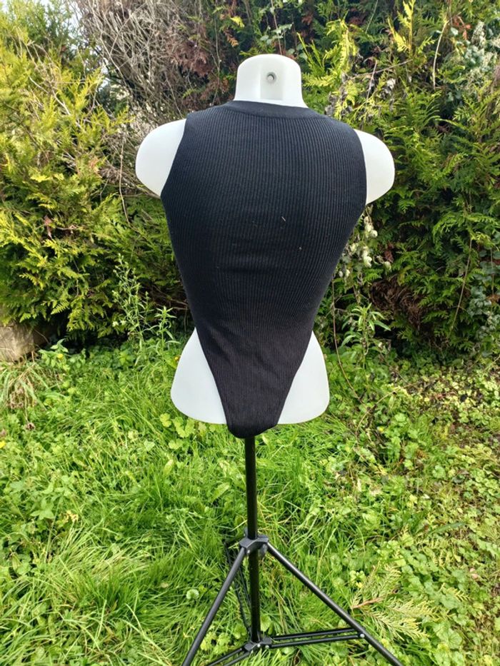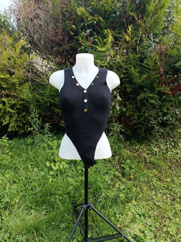 Body noir avec décolleté réglable grâce aux boutons Remonte assez haut niveau des hanches Taille unique ( je dirais quand même plus du S au L )