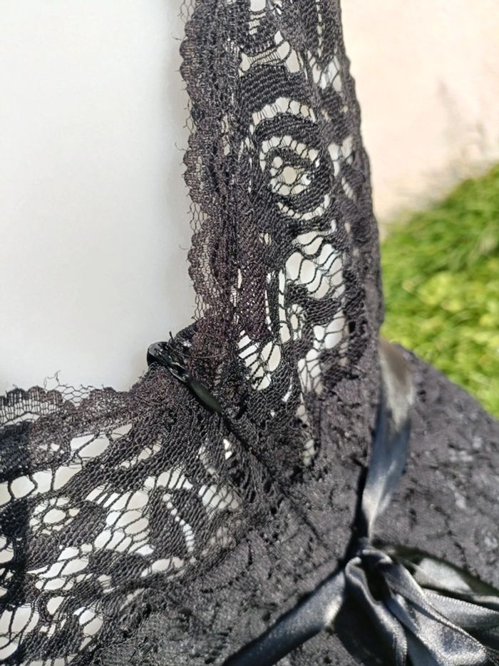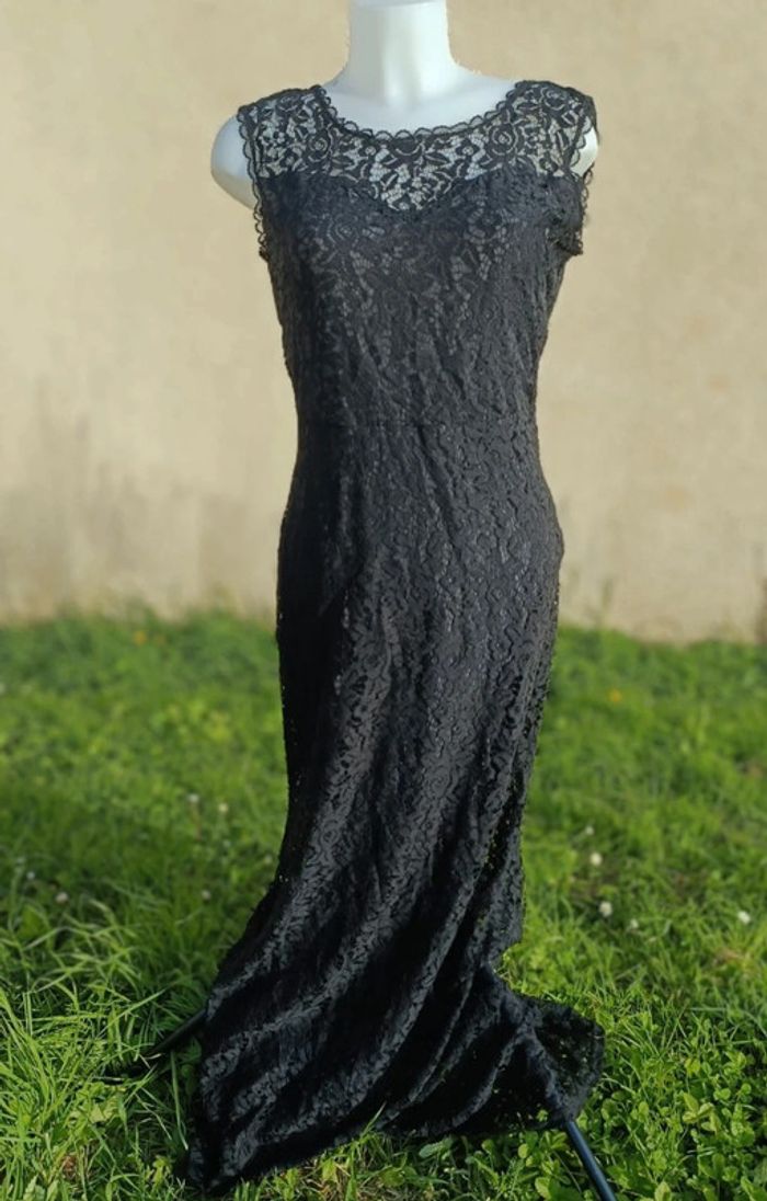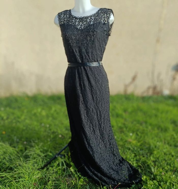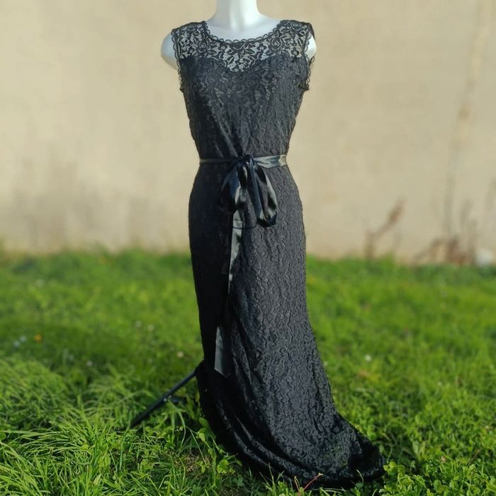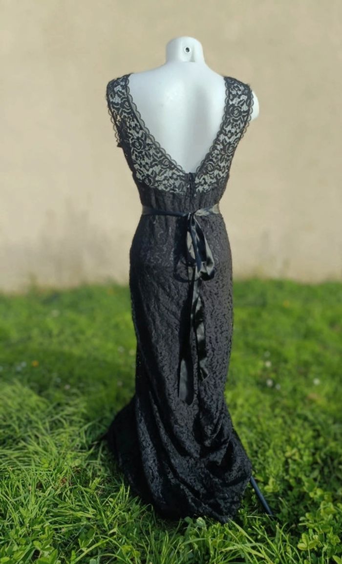 Robe longue noire avec détail dentelle et décolleté dans le dos Prêt du corps L'étiquette de la taille a été coupée pour ne pas que ça se voit dans le dos mais taille unique et très élastique Peut se porter de différentes avec ou sans ceinture effet satin ( fournie ) Portée une fois le temps d'un défilé de mode donc maxi 30 minutes Légèrement abîmé sur le haut mais ne se voit pas portée