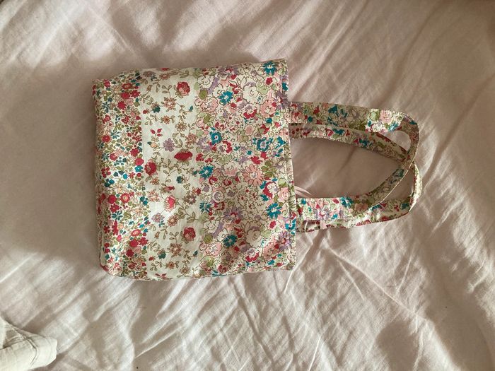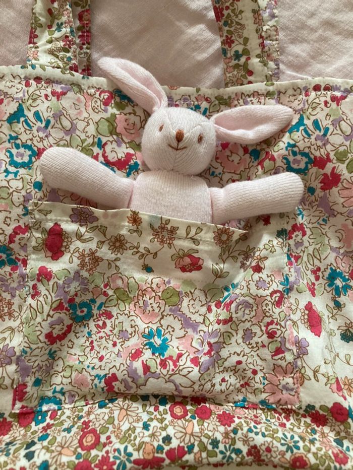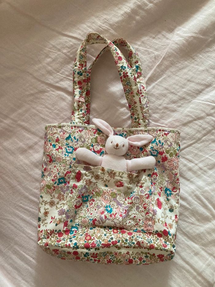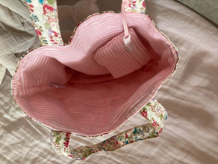 Trousselier Petit sac cabas Dimensions : 16,5 x 19 x 5,5 cm Anses de 12,5 cm de haut Hauteur totale avec anses : environ 29 cm Tissu à fleurs à l’extérieur et rayé à l’intérieur Petit porte monnaie rayé rose et blanc inclus ( noué à une anse ) Un petit lapin en peluche cousu dans la poche extérieure Une petite tache à l‘intérieur sinon très bon état ( voir dernière photo )