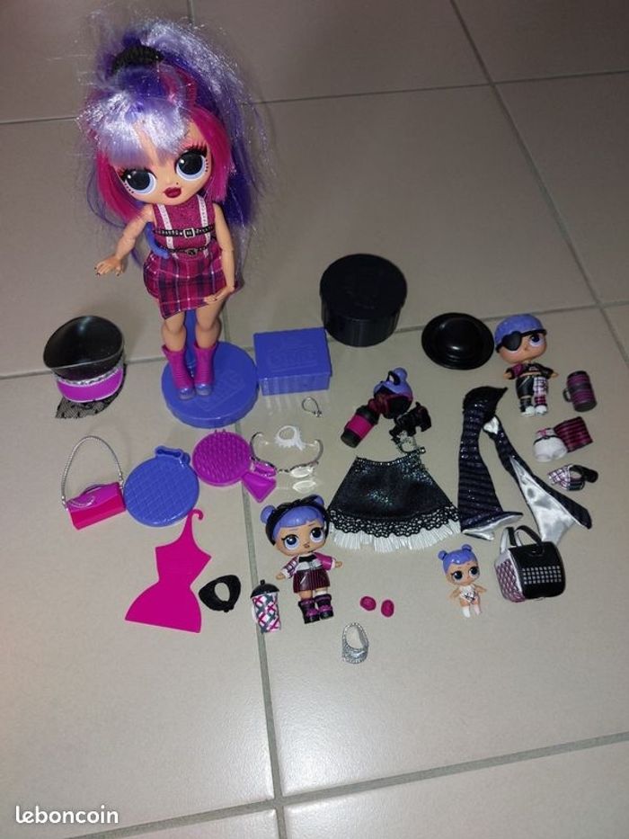 Vends une poupée LOL avec plusieurs figurines et accessoires plus une autre car pieds abîmés