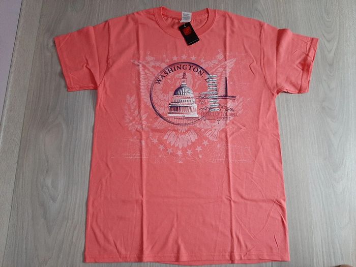 T-shirt homme rose corail, imprimé Washington. 100% coton. Taille M. Neuf avec étiquette. Jamais porté.