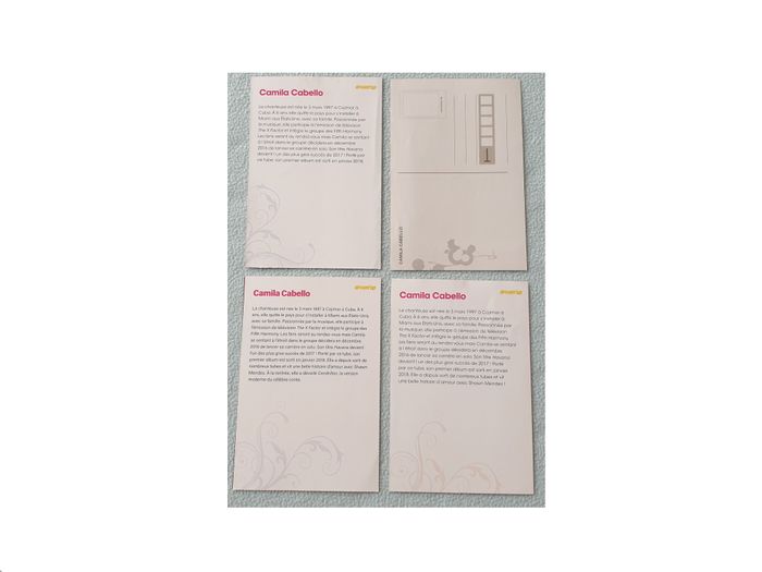 Camila Cabello. Lot de 4 photos de Camila Cabello issues de magazines. Dimensions : ≃ 10x15 cm - 3 de styles biographies - 1 de style carte postale En bon état. 1,00€ le lot. #vero38110chanteurs