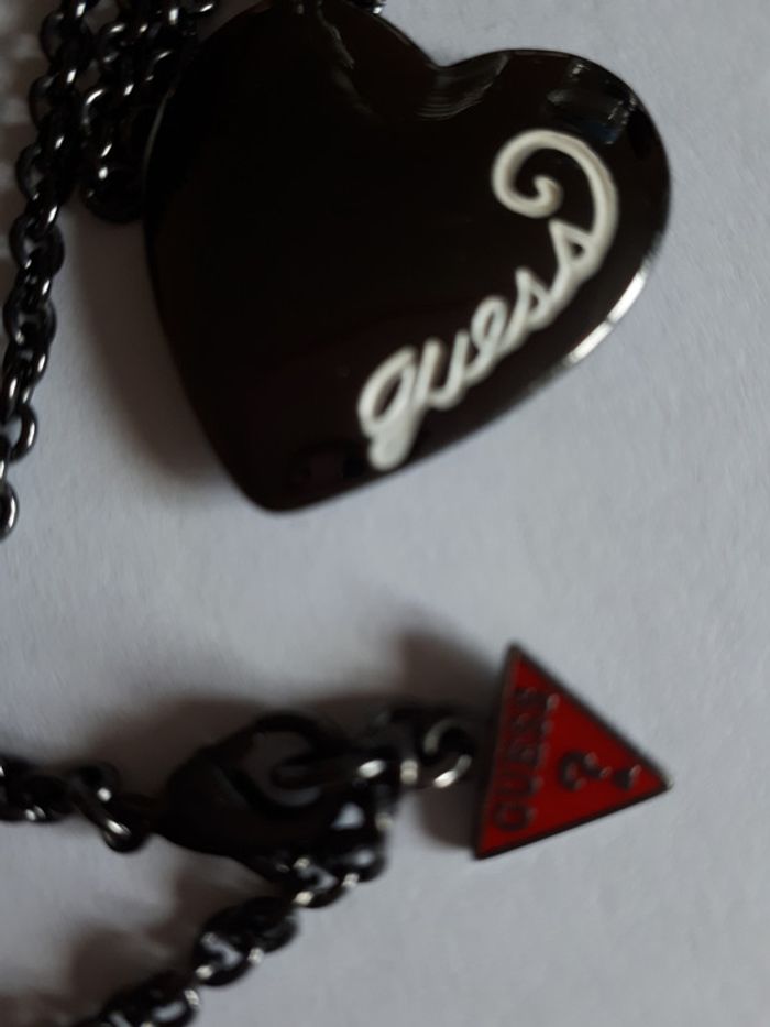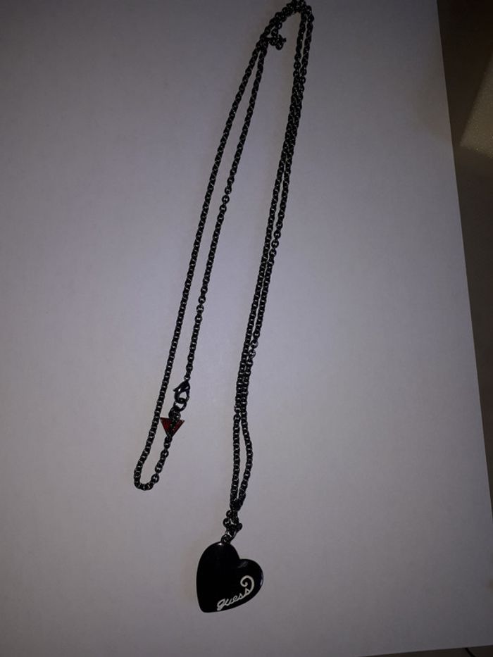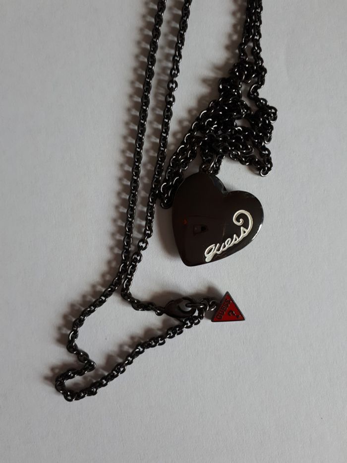 Etat neuf grand collier de marque authentique Guess couleur gris anthracite avec pendentif en forme de gros coeur. Acheté 49 euros en magasin.
