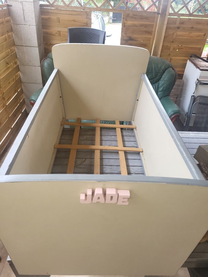 Lit en bois bebe avec sommier plus cas laver et à repeindre à votre goût. Petit trou rond sur le côté pour accrocher le mobile. A venir chercher sur place 24610.