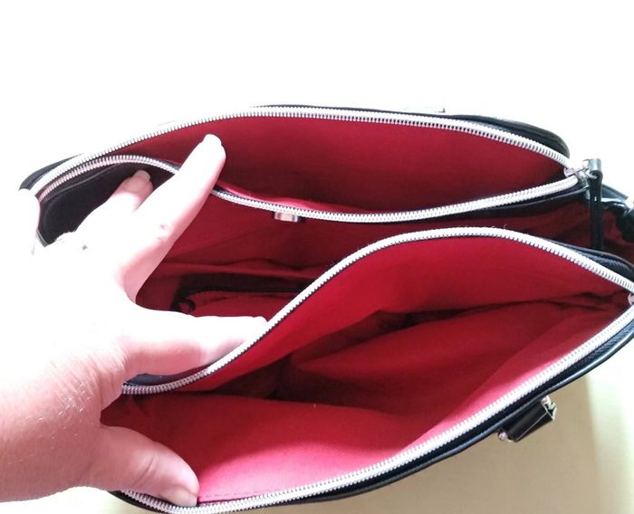 3 poches dont 2 à fermeture éclair et une à bouton pression. Intérieur rouge. #cyberangel0375femme #cyberangel0375fem_sacamains