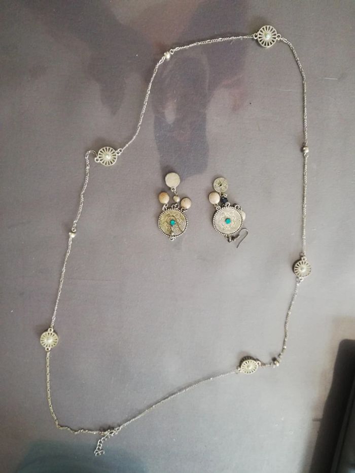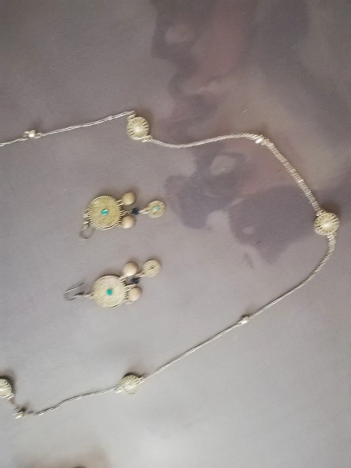 Boucles d'oreilles métal et bleue (manque un petit rond bleu sur le bas d'une boucle) 1 collier long métal et bleu 1 collier perles bleues