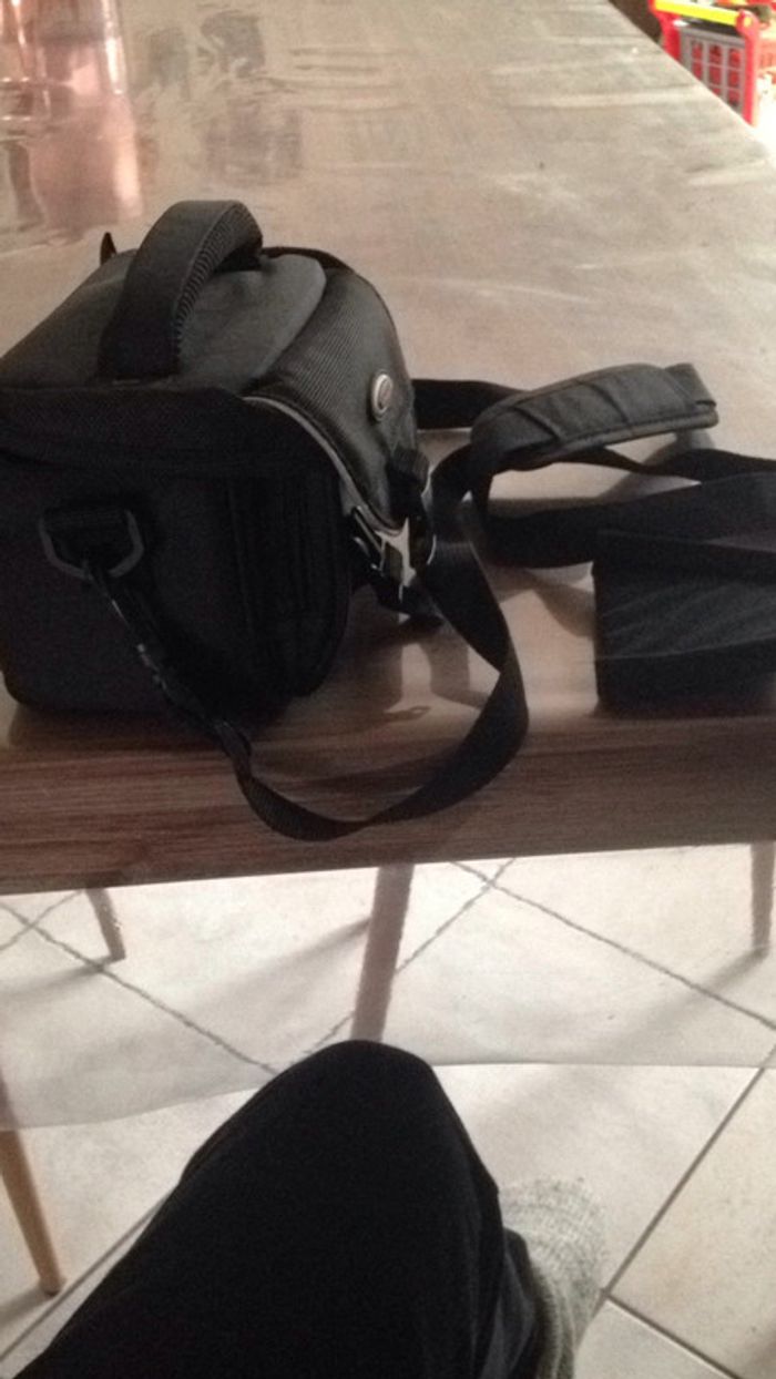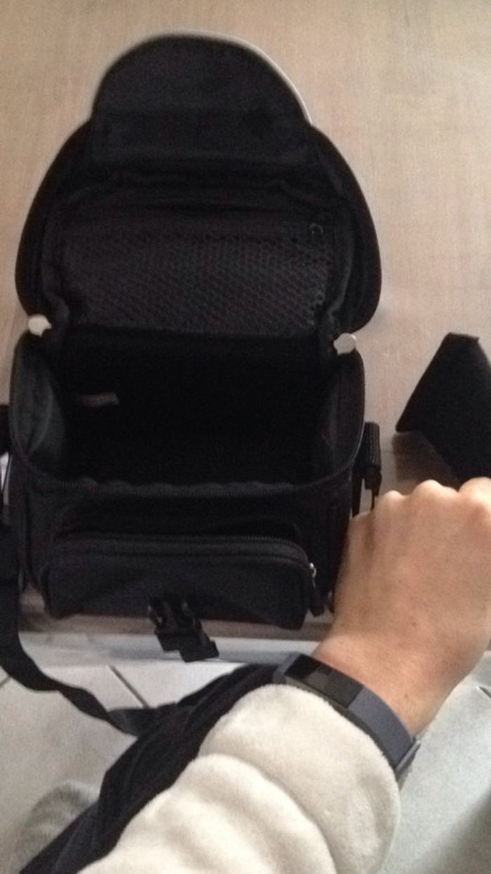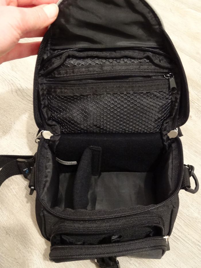 noir multi poche devant a linterieur.... tres bon etat 13cm pour mettre l'appareil en longueur 2eme compartiment qui se scratch n'importe où dans les 13cm 7cm de largeur