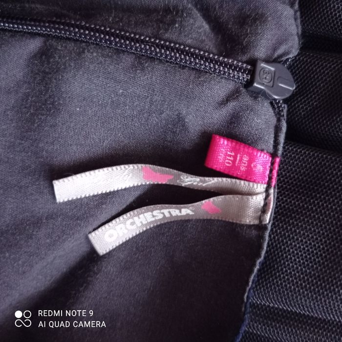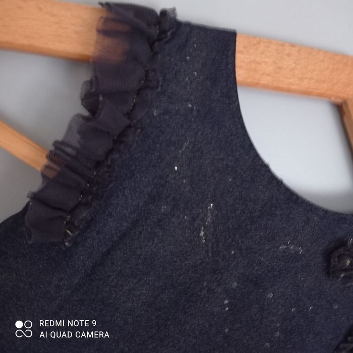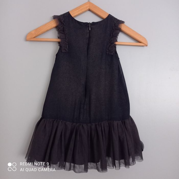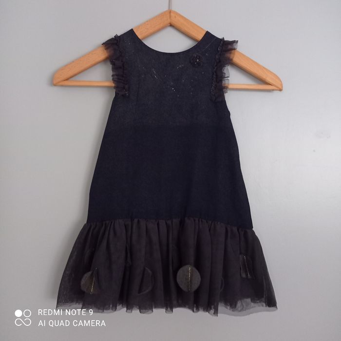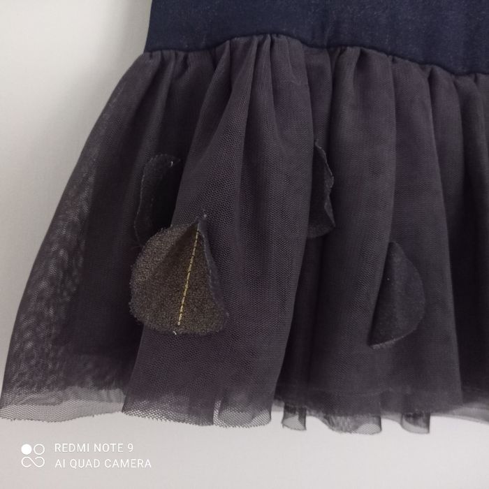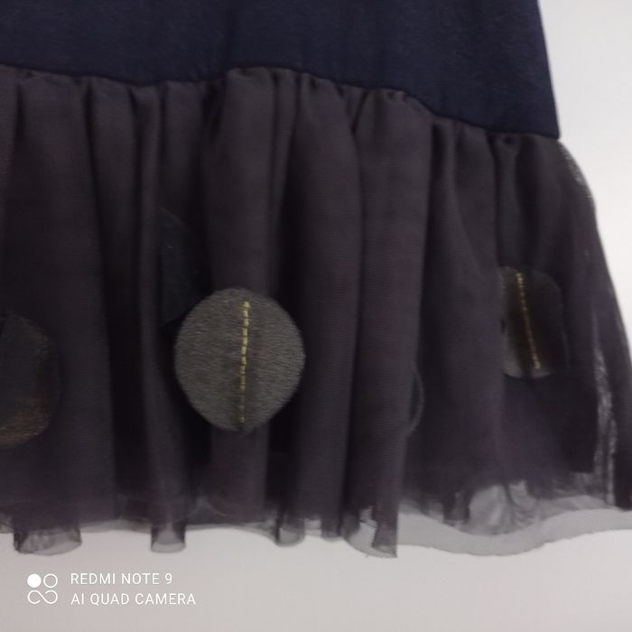Un peu dorée. Idéale pour les fêtes. Une démarcation entre la partie dorée et la partie bleu marine. Tulle aux manches. Partie jupe en tulle avec grosses pastilles. Une fleur en volume.