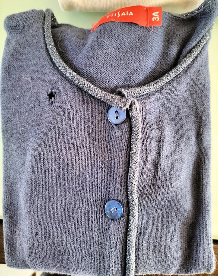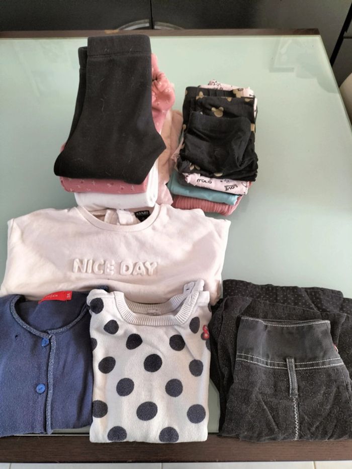 Lot de vêtements de 3 ans de 13 pièces 3 pantalons molletonnés, 5 leggings, 2 sweets dont un a des petites tâches (voir photos), 1 jupe, 1 short court, 1 gilet avec un petit trou devant (voir photo).