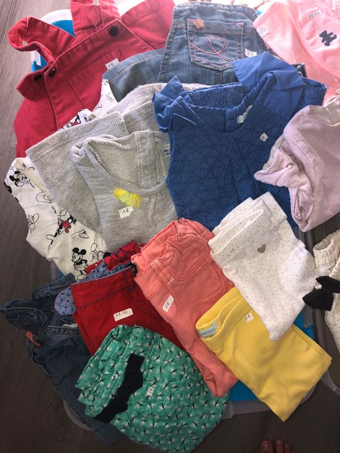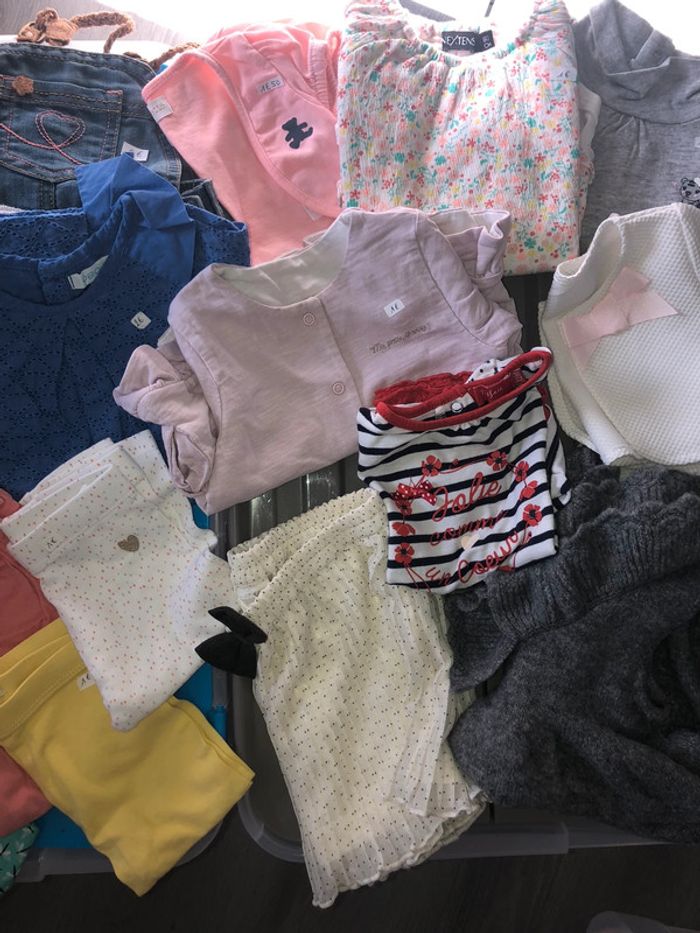 Lot de 19 articles taille 12 mois de différentes marques composés de : 5 robes 2 gilets courts 1 gilets 1 bodies tee shirt 1 tee shirt col roulé 4 pantalons 2 leggings 1 jupe 1 barboteuse 1 tee shirt