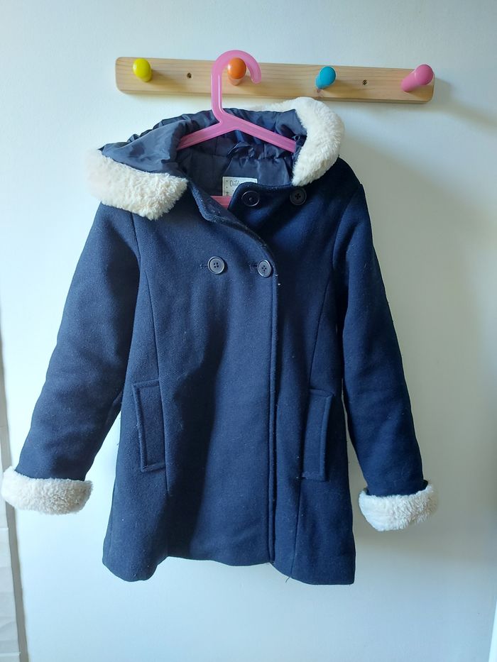 Manteau caban hiver Vertbaudet Taille 9 ans 44% laine, 27% polyester, 21% acrylique, 6% polyamide, 1%viscose, 1% coton Couleur bleu marine Fourrure aux poignets et autour de la capuche Très bon état, porté une seule saison