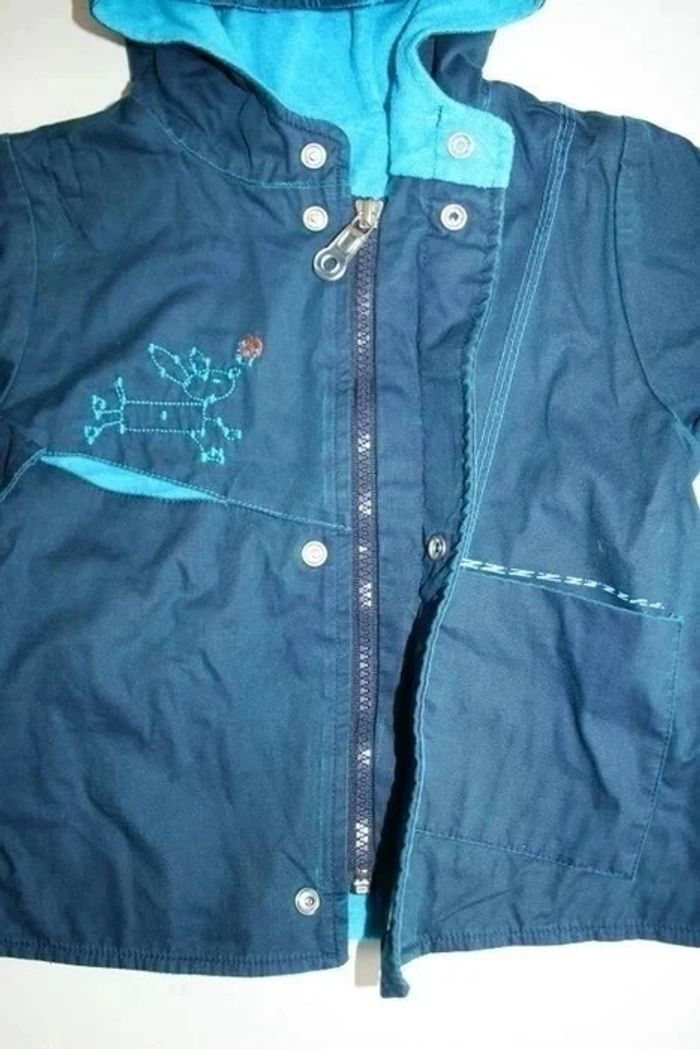 Veste Marèse à capuche bleue marine doublée éponge turquoise, fermeture éclair + pressions, imprimé à l'arrière un peu passé, 200g